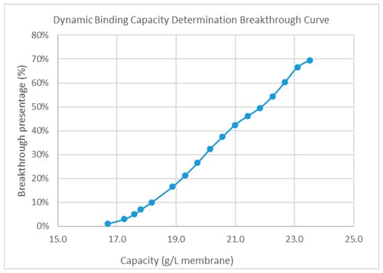 The binding capacity studies were carried out as follows: the membranes were initially cleansed with equilibration buffer for 15 membrane volumes (MVs) at the RT of 18 s. The HIMC Load (pH 5.5, 140 mS/cm, the sample conductivity was adjusted by 3 M (NH4)2SO4 solution) was then continuously loaded on Sartobind® Phenyl with a membrane volume of 3 mL at a residence time of 18 s until the UV absorbance at 280 nm showed a 10% breakthrough. The concentration of the flow-through samples was measured using UV Spectrophotometer-NanoDrop one (Thermo Fisher, Delaware, DE, USA) with the molecule-specific extinction coefficients. No dilution was required for any of the samples. After that, the membrane was washed with 15 MVs of equilibration buffer, and the proteins were flushed out with 15 MVs of elution buffer. After stripping, the membrane was sanitized with 15 MVs of sodium hydroxide, neutralized with HPW, and stored in 20% v/v ethanol.