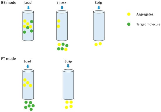 In downstream biopharmaceutical purification processes, both BE and FT modes represent widely employed chromatographic techniques, though their applications differ significantly based on resin characteristics [27,28]. The FT mode is predominantly utilized in AEX to remove residuals like host cell protein (HCP) and host cell DNA (HCD) rather than aggregates. The BE mode finds principal application in HIC and CEX, where target molecule–resin interactions require controlled binding and subsequent elution to get rid of aggregates. However, it is well known that the BE mode of HIC has a lower dynamic binding capacity (DBC) and requires an extended processing time and various buffers [29]. Additionally, the HIC-BE mode necessitates substantial salt addition to elevate sample conductivity during loading, which may induce protein precipitation and/or denaturation, potentially compromising product integrity [30]. On the contrary, the FT mode has a substantially higher loading density, adsorbs only impurities, and requires no additional recovery equipment [14]. Therefore, in this study, we will explore the possibilities of HIC membranes for both BE and FT modes to improve the process efficiency as much as possible while ensuring the removal of impurities.