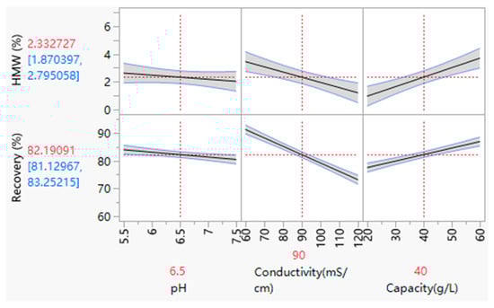 Prediction profiler depiction of changes in the HMW level and recovery as a function of the factors studied in the DoE. Note: vertical dotted lines represent the current value or current setting of each independent variable (X-variable); horizontal dotted lines indicate the current predicted value of each dependent variable (Y-variable) based on the current settings of the independent variables; the red fonts indicate the current value; the blue fonts represent the confidence intervals.