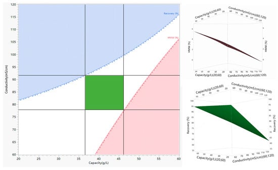 Based on the balance of recovery and HMW removal ability, the HMW level of less than 3.0% and recovery over 80.0% were set as the response requirements for HIMC FT mode. The design space was calculated by contour and surface plotters, as shown in Figure 7. Combined, the consideration of loading density and robustness of the process for scale-up, capacity between 37.0 and 45.0 g/L, loading pH 6.5, and loading conductivity between 78.0 and 91.0 mS/cm were recommended as the final process parameters.