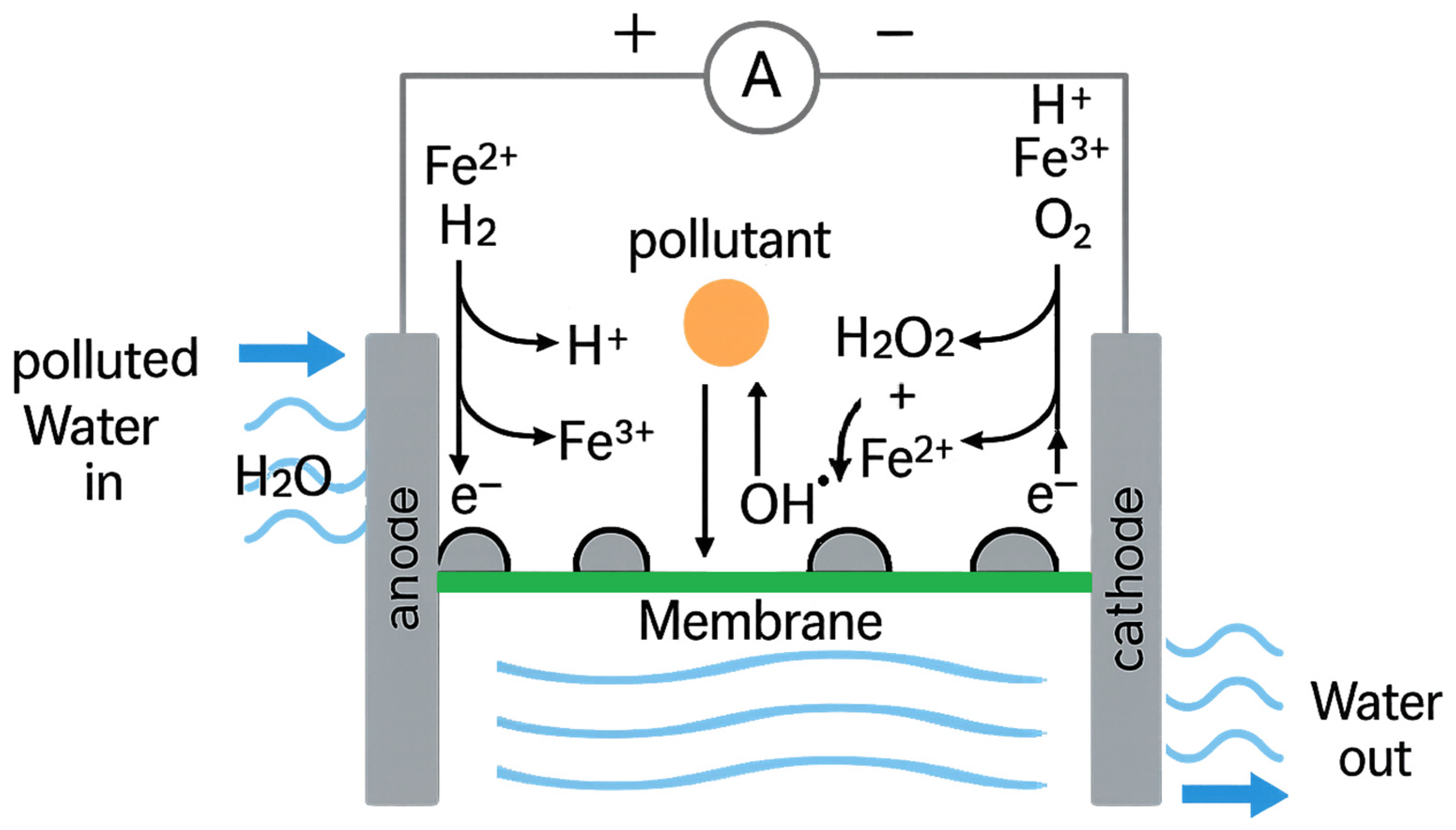 - Ni, L.; Wang, P.; Wang, Y. Sustainable Electro-Fenton Antifouling Strategy Simultaneously Improves Nitrogen-Removal Efficiency of Anammox in Membrane Bioreactors. Environ. Sci. Technol. 2025, 59, 17545–17557. [Google Scholar] [CrossRef]