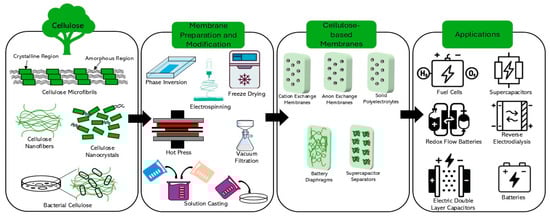 Cellulose-based membranes for separation and purification applications have been reviewed on several occasions [27,28,31,34]. A review on advances in the fields of flexible wearable electronics, thermoelectric nanogenerators, mechanical energy nanogenerators, sensors, electrodes, and photovoltaic solar cells was also recently published [35]. Meanwhile, there have been several reviews on cellulose-based membranes for energy applications, primarily focused on specific applications such as LIBs [36], supercapacitors [37], and fuel cells [38]. Specific membranes made of carboxymethyl cellulose (CMC) were also recently reviewed [39]. However, a review article discussing the progress on the application of cellulose-based IEMs and separators on a broad basis concerning various electrochemical systems for renewable energy applications is lacking.