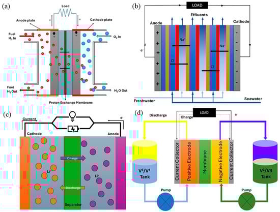 Schematic diagrams of (a) PEMFC, (b) RED, (c) LIB, and (d) VRFB.