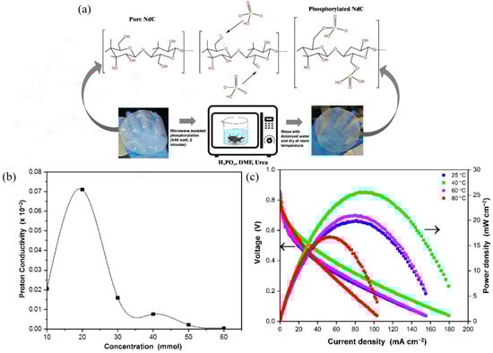 Chemical modification was also used to prepare a membrane comprising carboxymethylated bacterial cellulose (CMBC) combined with polyaniline (PANI) and 4-polystyrene sulfonic acid (PSSA) to yield CMBC/PANI [122] and BC/PSSA membranes [123], respectively. CMBC/PANI membrane exhibited relatively low ionic conductivity (25.2 mS cm−1), which might restrict its suitability for high-power-density fuel cell applications. In contrast, BC/PSSA was an ultra-thin (0.1 μm) membrane, suggesting potential advantages in applications where minimal thickness is crucial. The properties of the BC/PSSA nanocomposite membrane were improved and delivered one of the highest power densities among bio-based PEM in fuel cells (40 mW cm−2 at 125 mA cm−2). A similar BC/PSSA nanocomposite membrane exhibited high thermal stability (up to 155 °C), mechanical integrity coupled with ion exchange capacity of 1.85 mmol g−1, and proton conductivity of 1.73 mS cm−1. The membrane yielded a maximum power density of 2.42 mW cm−2 when it was tested in a single-chamber lab-scale MFC using a Shewanella frigidimarina pure culture [123]. An enhanced proton conductivity of 185 mS cm−1 (at 40 °C, 98% RH, in plane) was reported for a similar BC/PSSA membrane [124]. Earlier, the potential of BC/Nafion nanocomposite membrane with a 100 μm thickness and a proton conductivity of 140 S cm−1 (at 94 °C and 98% RH) was evaluated in PEMFC [125]. Figure 4 represents steps of fabrication and testing of a membrane made of BC synthesized from Cassava and microwave-assisted phosphorylation process (Figure 4a) produced 0.4154 μm thickness. The membrane with 20mmol phosphoric acid concentration produced the highest ion conductivity 71.0 mS cm−1 at room temperature (Figure 4b). The membrane performance in a single-cell setup resulted in a high power density of 25 mW cm−2 at 40 °C which can be seen from Figure 4c that shows the polarization curve (left arrow) and power density (right arrow) profile at various operating temperature [126].