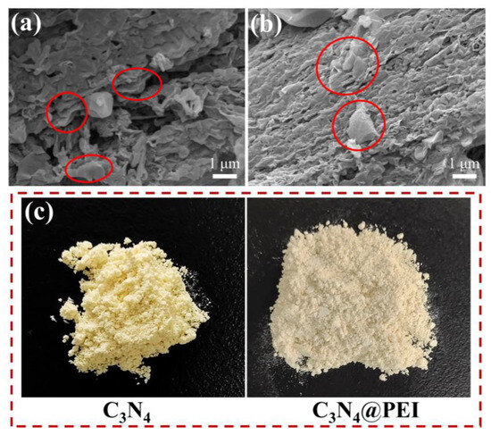 The structure and morphology of the prepared materials were investigated using SEM and optical photographs, as illustrated in Figure 3. The SEM images of bulk g-C3N4 depict that g-C3N4 was composed of graphite flakes, while the synthesized CN nanosheets displayed an irregular layered structure resulting from the aggregation of graphite-like planes (indicated by the red circles in Figure 3a). After modification, the nanosheets showed minimal structural changes (indicated by the red circles in Figure 3b). The structural differences between them will be elaborated in detail in the subsequent XRD images (Figure 5a). Furthermore, the modified CN@PEI nanosheets appeared darker than the control unmodified CN nanosheets (Figure 3c).