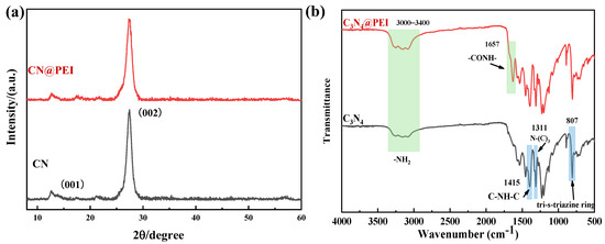 Figure 5 displays the XRD and FTIR spectras of CN and CN@PEI nanosheets. Two distinctive diffraction peaks of CN are evident in the XRD pattern (Figure 5a). The sharp reflection peak at 27.56° corresponds to the stacking of aromatic planes (002) with a d-spacing of 0.322 nm [25]. Another peak at 12.62° with a d-spacing of 0.653 nm corresponds to the periodic repetition of tri-s-triazine units [37]. This observation further confirmed the presence of triangular nanopores in CN. Additionally, the characteristic peaks of the pristine CN nanosheets were also observed in the XRD pattern of CN@PEI nanosheets, which indicated that the structure and morphology of the pristine CN nanosheets remained largely unchanged after amino functionalization.