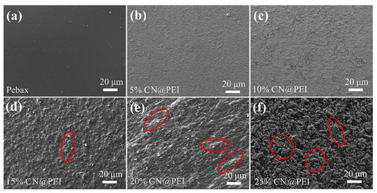 Surface SEM image of (a) pure Pebax membrane, and surface SEM images of Pebax/CN@PEI MMMs with loading capacity of different fillers (b) 5 wt%, (c) 10 wt%, (d) 15 wt%, (e) 20 wt%, and (f) 25 wt%.