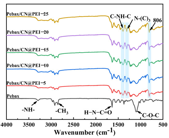Figure 9 shows the FTIR spectra of the pure Pebax membrane and the MMMs loaded with CN@PEI nanosheets. For the pure Pebax membrane, the vibrational peak at 1097 cm−1 was attributed to the tensile vibration of the C-O-C group induced by the soft segments of PEO in the Pebax phase, while the characteristic absorption peaks of the -NH- and H-N-C=O groups of the PA hard segment in the Pebax matrix appeared at 1636 and 3292 cm−1 [40,41]. The FTIR spectrum of CN exhibited a strong peak at 806 cm−1 corresponding to the vibration of the tri-s-triazine ring [42], thereby confirming the presence of the CN structure within the membrane matrix. Furthermore, distinct sharp absorption bands were also observed at 1311 cm−1 and 1415 cm−1, corresponding to the stretching vibration modes of N-(C)3 and C-NH-C units [23]. These results unequivocally confirmed the successful incorporation of CN@PEI nanosheets into the polymer matrix.