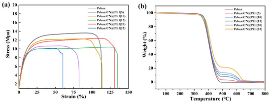 (a) Tensile testing and (b) TGA curves of pure Pebax membrane and Pebax/CN@PEI MMMs.