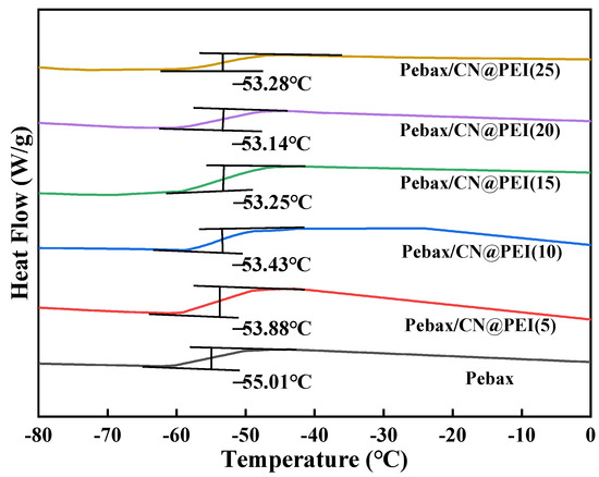 Differential scanning calorimetry (DSC) analysis was performed to characterize the thermal properties of both pure Pebax membranes and Pebax/CN@PEI MMMs (Figure 11 and Table S1). As the content of CN@PEI nanosheets increased from 5 wt% to 20 wt%, the Tg displayed a rising trend from −53.88 °C to −53.14 °C, while the Tg of the pure Pebax membrane was measured at −55.01 °C. When CN@PEI loading increased to 25 wt%, the agglomeration of the nanosheets led to the formation of interfacial defects with the polymer matrix, inducing a reduction in Tg. Consequently, the elevated Tg implied that the presence of CN@PEI nanosheets reduced the polymer chain flexibility. This restricted mobility of the polymer chains enhanced resistance to larger gas molecule transport, thereby improving CO2/CH4 selectivity.