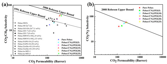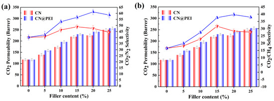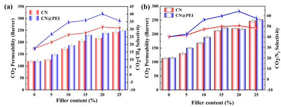 Effect of different filler contents on the gas separation performance of membranes in the dry state: (a) CO2 permeability and CO2/CH4 selectivity of membranes; (b) CO2 permeability and CO2/N2 selectivity of membranes (membranes tested at 2 bar, 25 °C).