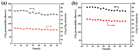 Long-term continuous gas permeation tests of Pebax/CN@PEI MMMs with a 20 wt% loading (Pebax/CN@PEI (20) MMM) were conducted to assess the stability of the membrane. As Figure 15a shows, the separation performance of the Pebax/CN@PEI (20) membrane was evaluated in CO2/CH4 (50/50 vol%) and CO2/N2 (50 vol%: 50 vol%) mixed gas systems over 70 h. For the full 70 h duration, minor fluctuations in CO2 permeability ranging from 216 to 249 Barrer and CO2/CH4 selectivity from 34.1 to 38.9 Barrer were observed. Furthermore, the long-term stability test results of the mixture gas of CO2/N2 (50 vol%: 50 vol%) were similar, where CO2 permeability ranging from 228 to 252 Barrer and CO2/N2 selectivity from 56.8 to 61.9 were tested. These results demonstrated that the membranes exhibited exceptional stability during long-term testing, which ascribed to the stabilization of amino groups in the mixed matrix membrane originating from the robust interaction between PEI and CN nanosheets.