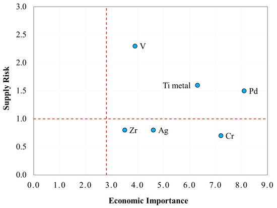 The criticality indexes of the investigated elements (Pd, V, Ti, Zr, Ag, and Cr) were obtained using the calculations proposed by the European Commission [11]. The results, indicated in Figure 2, show an EI index above the criticality threshold for all the elements: Pd, V and Ti exceeded even the SR index threshold and were, therefore, considered critical.