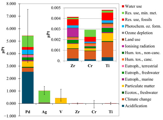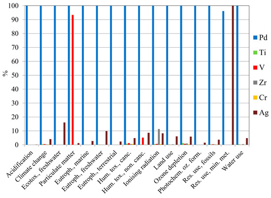 The results indicated that palladium had a significant contribution across almost all impact categories, except in “Resource use, minerals and metals” where silver had the highest impact. In addition, vanadium showed a notable impact in the “Particulate Matter” category.