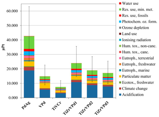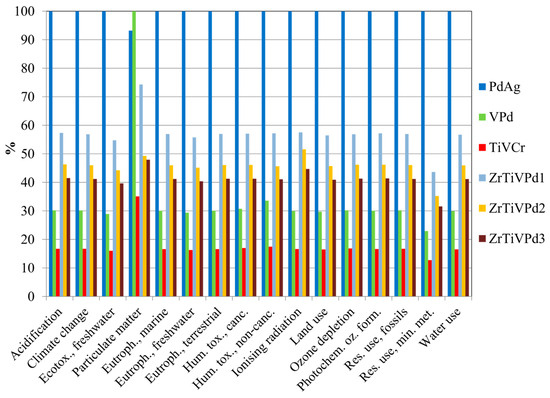 Compared to the reference membrane, which showed the highest overall impact, the least impacting membrane was the TiVCr (82.5% lower), followed by the VPd (65.3% lower). Furthermore, it is evident that reducing the Pd content in TiZrVPd membranes effectively lowered the weighted environmental impacts, and on average, their overall impact is 53.1% lower than the PdAg membrane. The impact categories with the highest contribution to the overall impacts were found to be “Acidification”, “Resource use, minerals and metals”, and “Particulate matter” for all the investigated membranes.