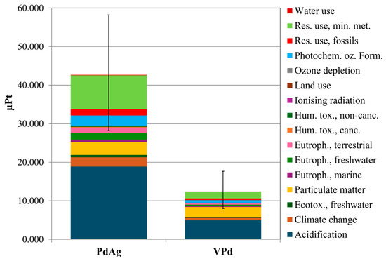 Single score results of the VPd and PdAg membranes and their respective uncertainty ranges, considering 95% confidence interval. FU: the PdAg membrane permeance (2.03 × 10−6 mol m−2 Pa−1 s−1 for a 3.16 µm thick membrane); the LCA reference flow of PdV was the mass of the membrane deposited with a thickness of 2.66 μm onto 2.56 cm2 alumina substrate.