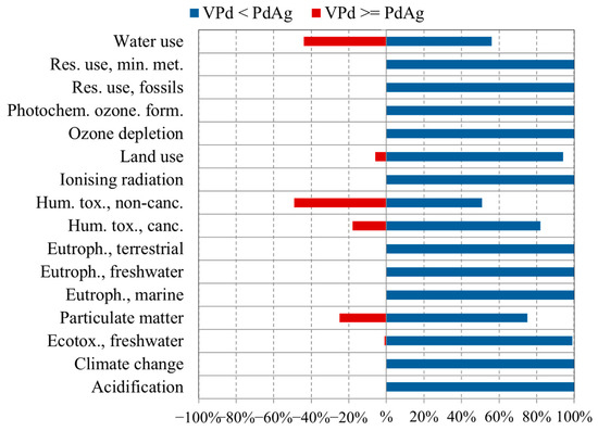 On the contrary, VPd with a high selectivity (80% higher than the reference), a permeability of 5.40 × 10−12 mol m−1 Pa−1 s−1, and lower total impacts than the PdAg reference membrane, can be considered as a suitable candidate composition for such membranes. To account for the performance of the membranes, a further LCA was carried out, using the PdAg membrane permeance as FU. The hypothetical thickness of the VPd membrane required to match the PdAg permeance (2.03 × 10−6 mol m−2 Pa−1 s−1 for a 3.16 µm thick membrane) was calculated based on the material permeability. This calculation yielded the corresponding membrane mass reference flow used for the LCA analysis. The resulting thickness value was 2.66 μm, which remained reasonable for a potential practical application. Therefore, the reference flow (i.e., the respective membrane masses) used to carry out the LCA analysis was calculated as described previously in this section. As is possible to observe in Figure 8, the whole impact burden of VPd (the LCA characterized results are listed in Table S17 of SI) resulted to be 71% lower than the PdAg.