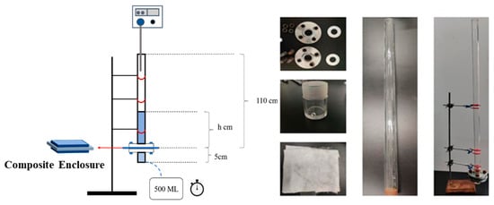 The enclosure material used in the experiments was sourced from an actual reservoir. As illustrated in Figure 1, the experimental setup consisted of the enclosure clamped between two flanges and sealed with a polytetrafluoroethylene (PTFE) gasket to prevent leakage. The flange type was DN32, with an inner diameter of 42 mm. Two acrylic glass tubes (outer diameter: 42 mm; inner diameter: 32 mm; height: 1.1 m) were connected to both ends of the flange assembly. The bottom of one tube was sealed, and a 6 mm diameter outlet was drilled on its side. A peristaltic pump with a flow rate range of 10–100 mL/min was used to feed the algal suspension into the system. The entire filtration unit was mounted on a metal stand for stability. The filtration flux was determined by measuring the volume of effluent collected in a 500 mL graduated cylinder over one minute. It should be noted that the actual falling water pressure difference in the source reservoir is 0.5 m head, so the water column height was maintained at 0.5 m (0.05 bar) throughout the membrane filtration simulation experiment. The water flux was controlled by adjusting the inlet and outlet flow rates.
