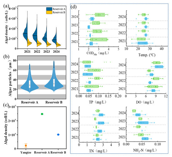(a) Temporal variations in algal density in Reservoirs A and B during 2021–2025. (b) Distribution patterns of algal particle size in Reservoirs A and B. (c) Comparison of mean algal density between the Yangtze River and Reservoirs A and B. (d) Water quality parameters at monitoring sites in Reservoirs A and B.