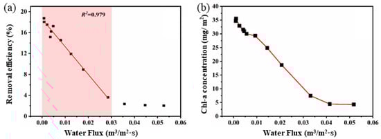 (a) Algae removal efficiency of composite microfiltration enclosure under different water fluxes. (b) Chlorophyll-a loading on composite microfiltration enclosure at varying water fluxes.