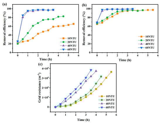 As the composite microfiltration enclosure primarily relies on physical interception, background turbidity may influence removal efficiency. To simulate actual water conditions, the experiments were conducted within a turbidity range of 10–60 NTU, which is close to the actual conditions in the region’s source reservoirs. As shown in Figure 4a,b, water turbidity significantly enhances the composite microfiltration enclosure’s algal interception effectiveness. Initially, the composite microfiltration enclosure achieved similar Chl-a removal efficiency of approximately 20% for algae-containing water at varying turbidities, while the removal efficiency for turbidity reached 65%. As the experiment progressed, at initial turbidities of 40 NTU and 60 NTU, the Chl-a and turbidity removal efficiencies surged to 80% and 95%, respectively, after 0.5 h, stabilizing after 1 h (approximately 95% for Chl-a and 95% for turbidity). This is because higher turbidity clogs the pores of the composite microfiltration enclosure, forming a continuous filter cake layer that reduces the pore size and significantly increases the interception efficiency [30]. This phenomenon did not occur in the experimental groups with initial turbidities of 10 NTU and 20 NTU, indicating that the filter cake layer was not fully formed under low turbidity conditions, resulting in a slower increase in interception efficiency. It is important to note that while removal efficiency was higher at higher turbidity, the time to reach the experimentally designed 0.5 m head was also shorter. This phenomenon conforms to the “dead-end filtration” kinetic model: the pressure passing through the filter increases linearly, and the resistance of the composite microfiltration enclosure also increases approximately linearly (Figure 4c). Furthermore, higher turbidity increases faster, and the time to reach the set resistance limit is shorter. Overall, within a certain range, higher turbidity increases the composite microfiltration enclosure’s interception efficiency for both algae and turbidity.