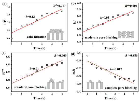 The flux-time data obtained from the experiments were fitted to each linearized model. The coefficient of determination (R2) was used to evaluate the suitability of each model and identify the dominant fouling mechanism.
