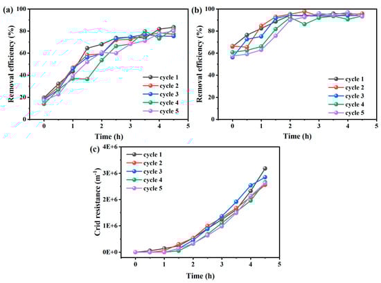 Changes in (a) Chl-a removal efficiency, (b) turbidity removal efficiency and (c) resistance after clean recycling of the composite microfiltration enclosure.