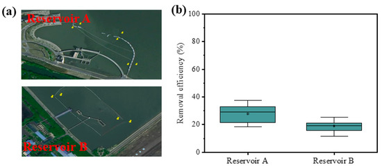 To assess the practical algae removal performance of the composite microfiltration cover, it was deployed at a water source in a city in eastern China, and the variation in total algal density before and after installation was monitored (Figure 8a). During operation, conventional water quality indicators (such as turbidity) at Reservoir A were generally consistent with the results of the pilot test (Table S1). However, as shown in Figure 8b, while the device exhibited some retention, its efficiency was significantly lower than observed under laboratory conditions. This discrepancy primarily arose from hydrodynamic limitations. In practice, the actual water head drop at Reservoir A was only 0.5 mH2O, while its average daily flow reached as high as 1.6 million tons, corresponding to a flux through the algal net of approximately 0.185 m3/m2·s. At this pressure, the theoretical maximum flux of the algal net was only 0.075 m3/m2·s, far below the actual flow rate, indicating that a large portion of the water bypassed the enclosure freely through its bottom. In addition, during sampling, strong winds, high waves, and elevated water levels led to partial submergence of the enclosure, allowing algal-containing water to circumvent the interception zone. Meanwhile, relatively stable downstream hydrodynamic conditions further promoted algal regrowth. These findings highlight that, in practical applications, optimizing the layout of the enclosure and accounting for environmental fluctuations are critical to improving algal removal efficiency.