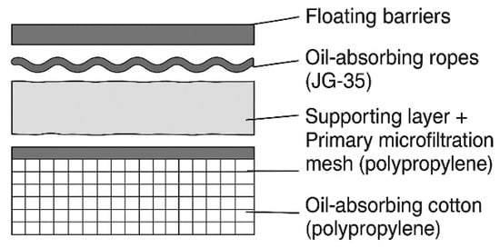 The composite microfiltration membrane used in this study was provided by Shanghai Chuanxi Technology Co., Ltd. (Shanghai, China) (Figure S1). As schematically illustrated in Scheme 1, the composite microfiltration enclosure system consists of a primary microfiltration mesh (polyethylene), a supporting layer, oil-absorbing ropes (JG-35), oil-absorbing cotton (polypropylene), and floating barriers. The key filtration component is the polyethylene mesh, which is contained within the oil-absorbing layer. Its thickness is 6–8 mm, and its fiber diameter is approximately 20 μm. For lab-scale testing, small sections of the enclosure material were cut into samples measuring 80 mm × 80 mm × 8 mm (Length × Width × Thickness) to fit the experimental filtration setup described in Section 2.3. Notably, the surface pore size cannot be directly measured by SEM due to the oil-absorbing cotton. The pore size of the microfiltration membrane is provided by the manufacturer and is approximately 50–100 μm.