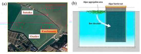 (a) Schematic diagram of the deployment location and (b) schematic diagram of the structural layout of the composite enclosure in the reservoir.