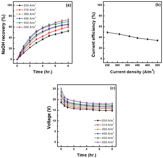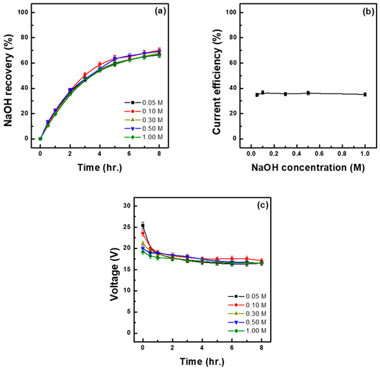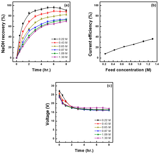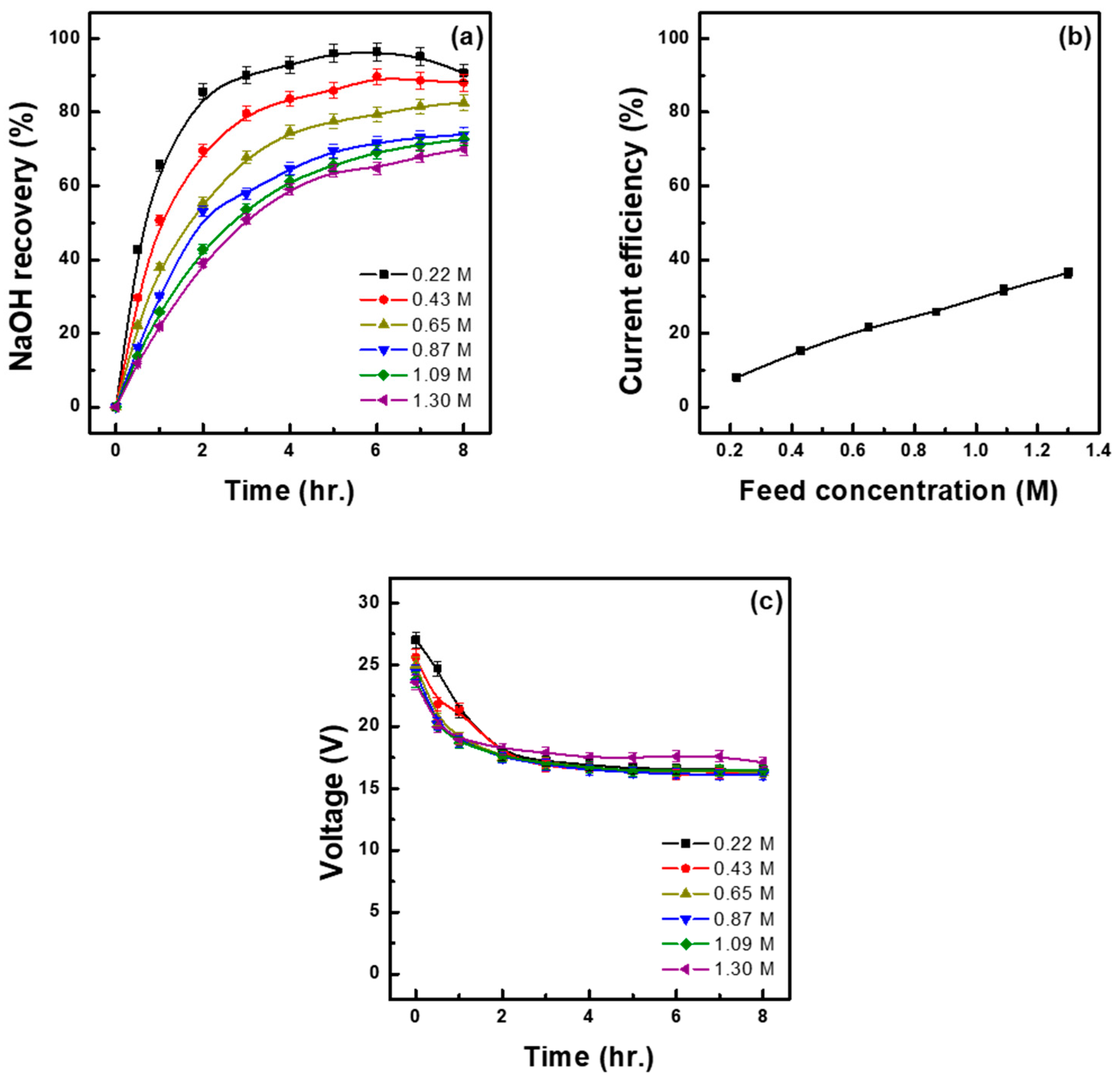 - As the concentration of the raw material solution increased, the base recovery rate decreased, whereas the recovery concentration actually increased. More specifically, 1.30 M Na2SO4 resulted in the lowest recovery rate of 70.00% but in the highest recovery concentration of 1.67 M. On the other hand, as the concentration of the raw material solution decreased, energy consumption increased, and current efficiency decreased. Therefore, from an economic perspective, it is more advantageous to use raw material solutions with higher concentrations.