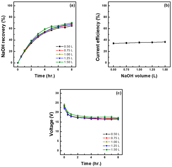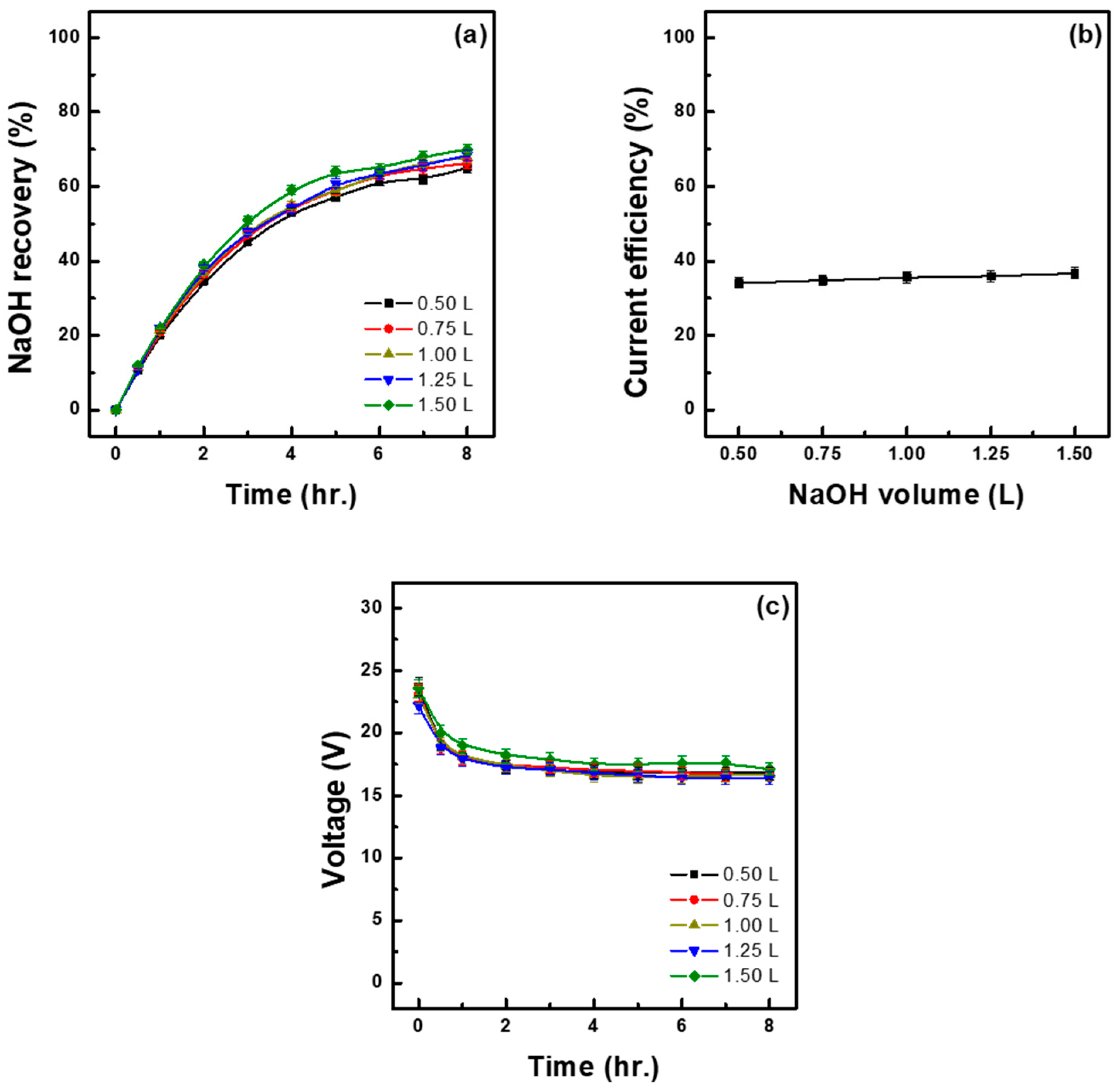 - To increase the concentration of the recovered base, it is advisable to adjust the initial volume of the added base solution. The highest recovery concentration (2.85 M) was achieved when the initial volume was adjusted to 0.50 L, which is thus considered as the most suitable when the objective is to recover high-concentration bases. On the other hand, when the initial volume of the base solution was 1.00 L, the recovery concentration was 2.13 M (slightly lower than that achieved at 0.50 L) but resulted in the lowest energy consumption and a higher current efficiency, making this volume suitable for ensuring stability and efficiency in long-term operations.