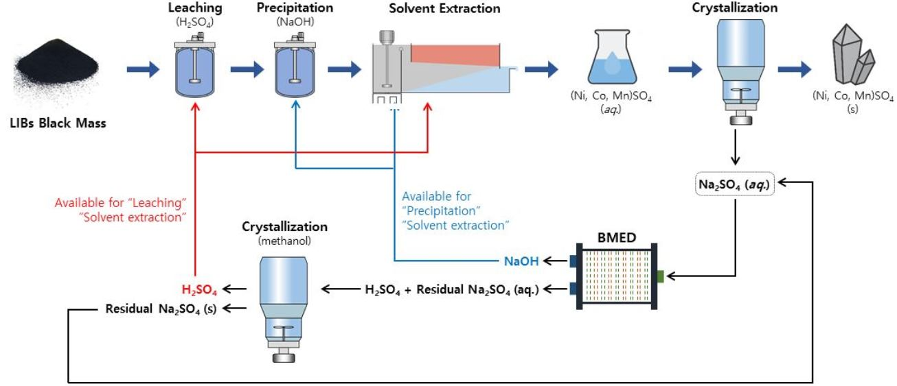 - Lee, Y.; Seo, M.; Ahn, J. Regeneration of NaOH from the Spent Na2SO4 Solution by Two-Compartment Bipolar Membrane Electrodialysis. Korean J. Met. Mater. 2025, 63, 281–290. [Google Scholar] [CrossRef]