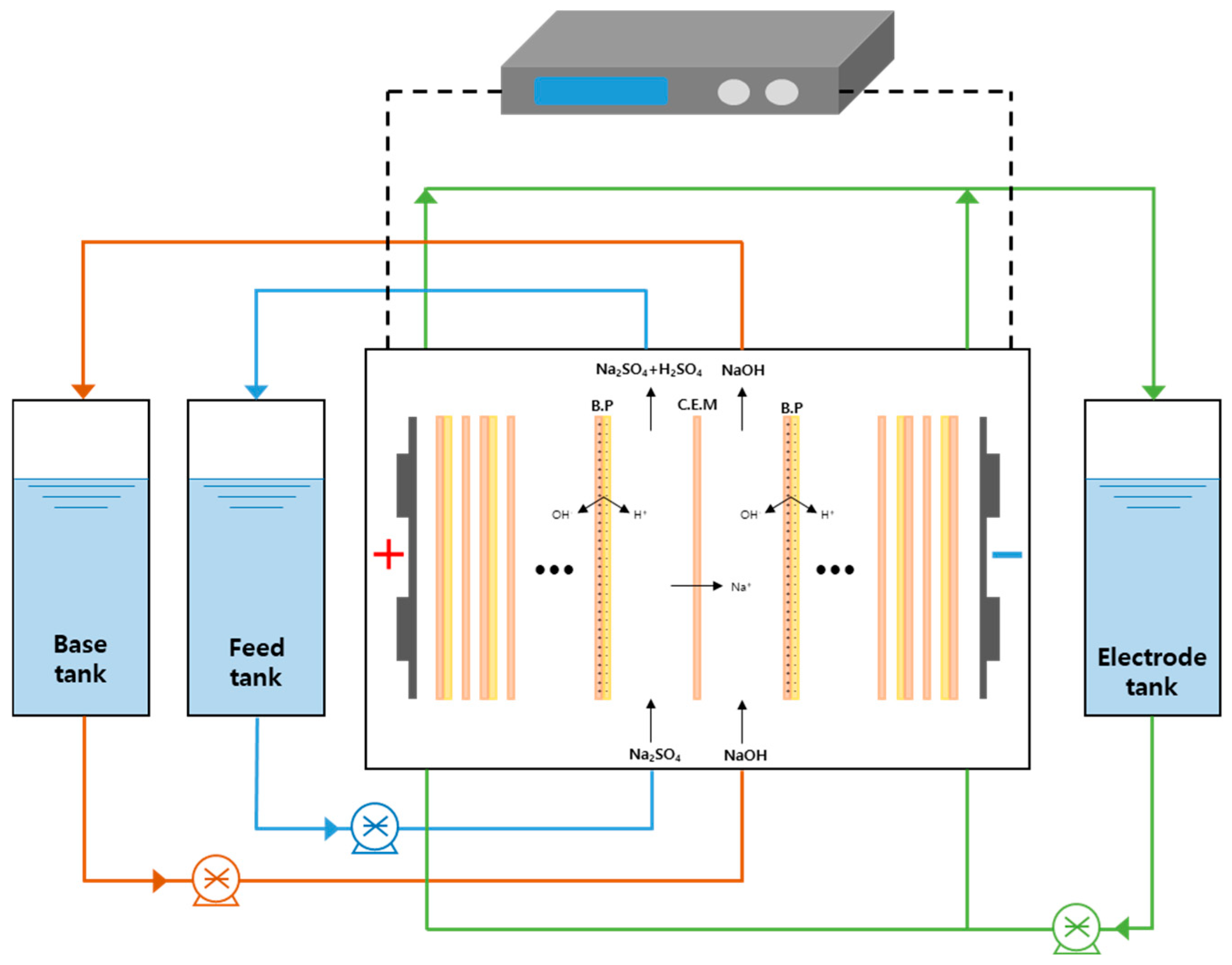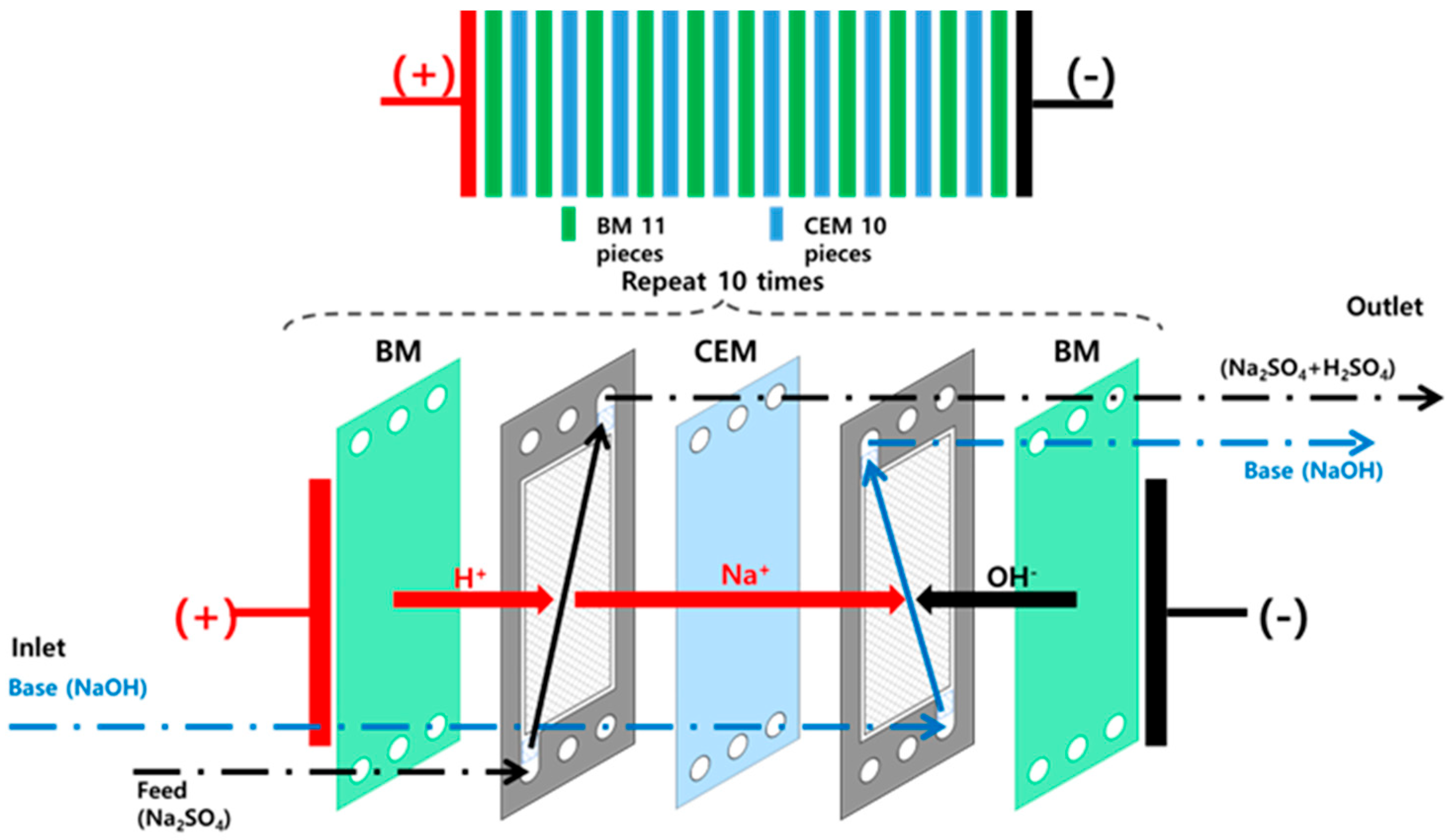 - Cho, Y.C. A Study on Na2SO4 Treatment Using Bipolar Electrodialysis System. Ph.D. Thesis, Daejin University, Pocheon, Republic of Korea, January 2024. Available online: http://www.dcollection.net/handler/daejin/200000014751 (accessed on 29 September 2025).