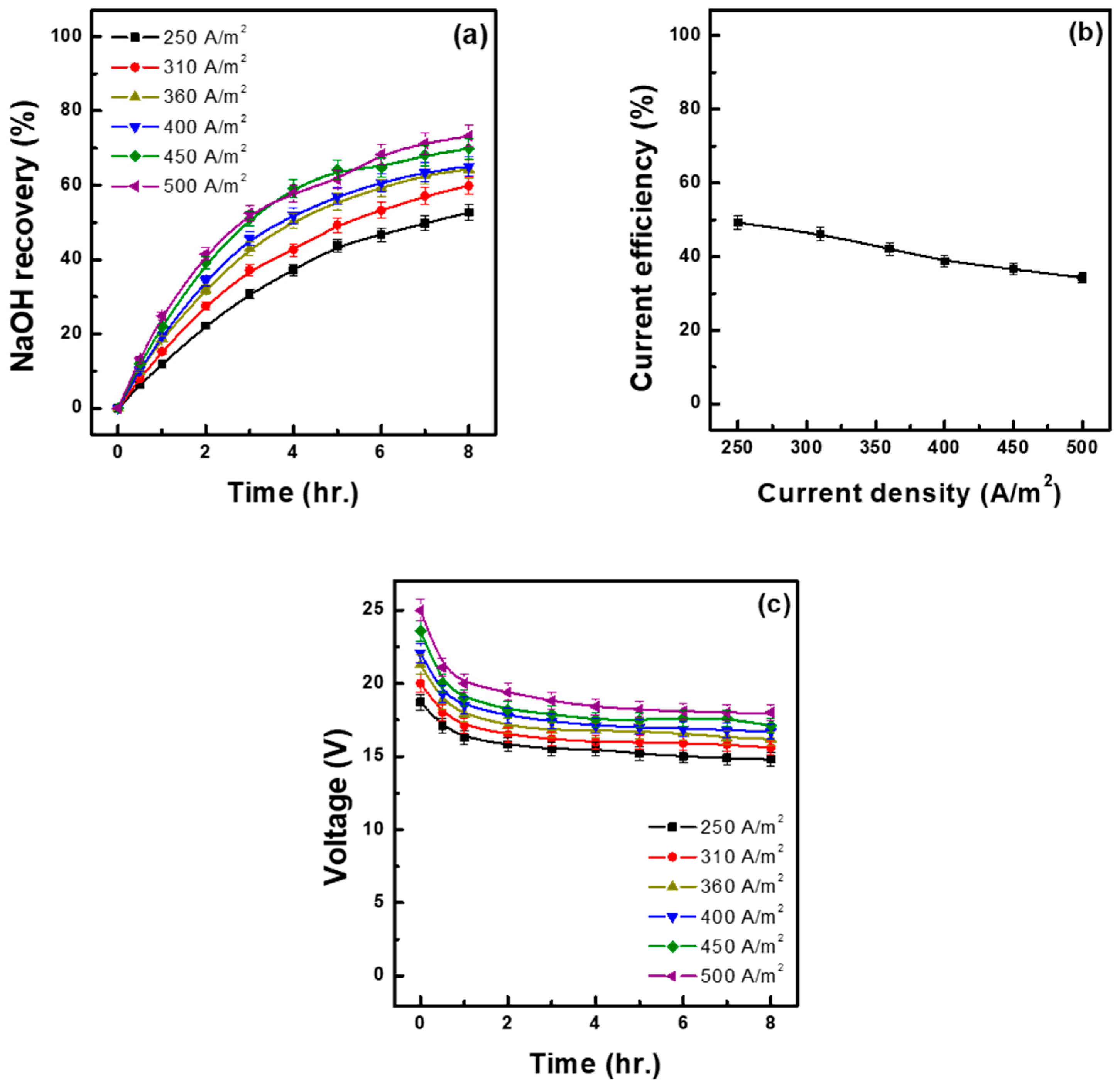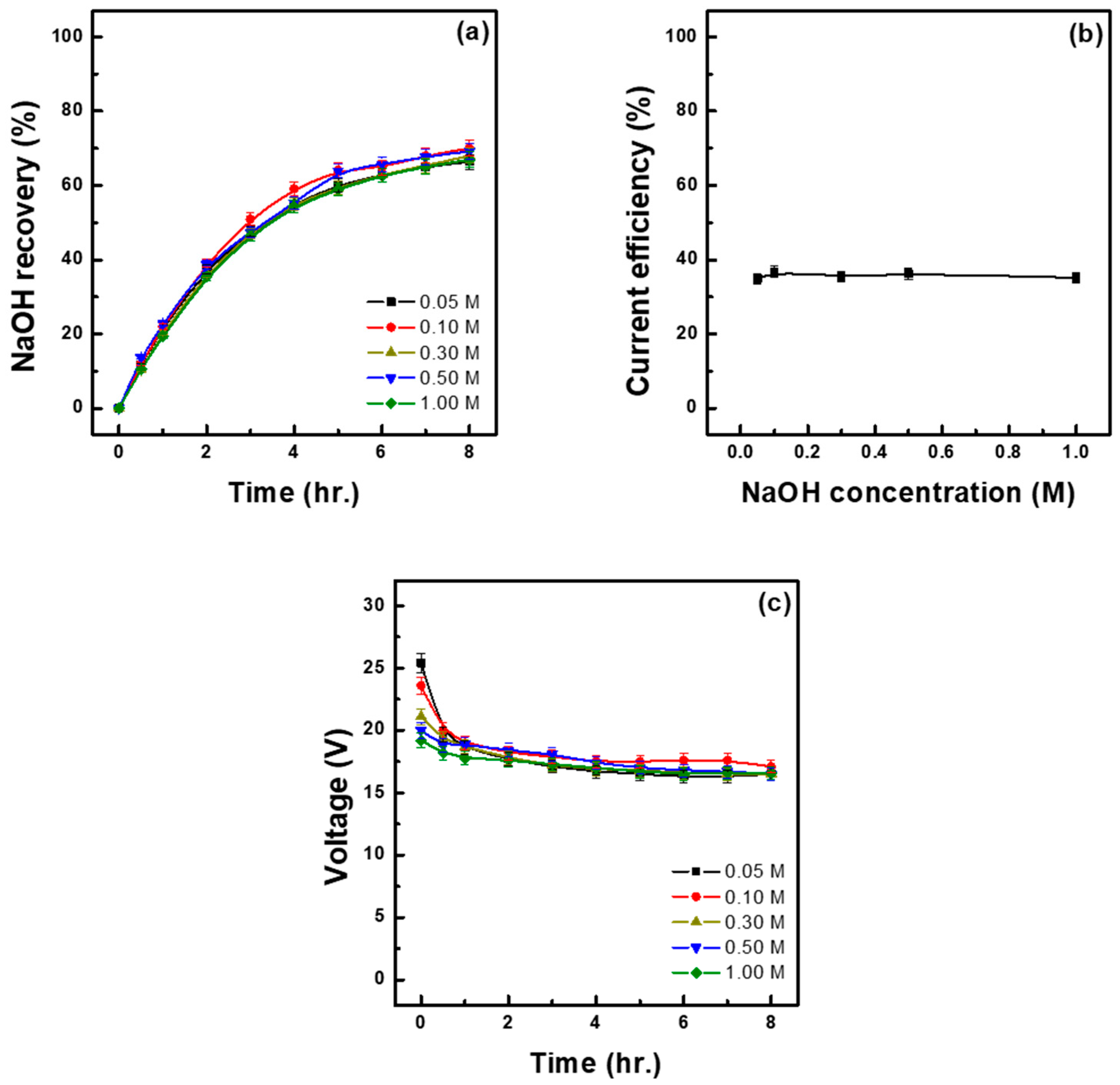 - The initial concentration of the base does not directly affect the base recovery rate. However, if it is excessively low, it may lead to increased electrochemical resistance and reduced energy efficiency. Conversely, if it is excessively high, it may limit the increase in the concentration of the recovered base. Therefore, considering both energy efficiency and process stability, the optimal initial base concentration is within the range of 0.1–0.5 M.