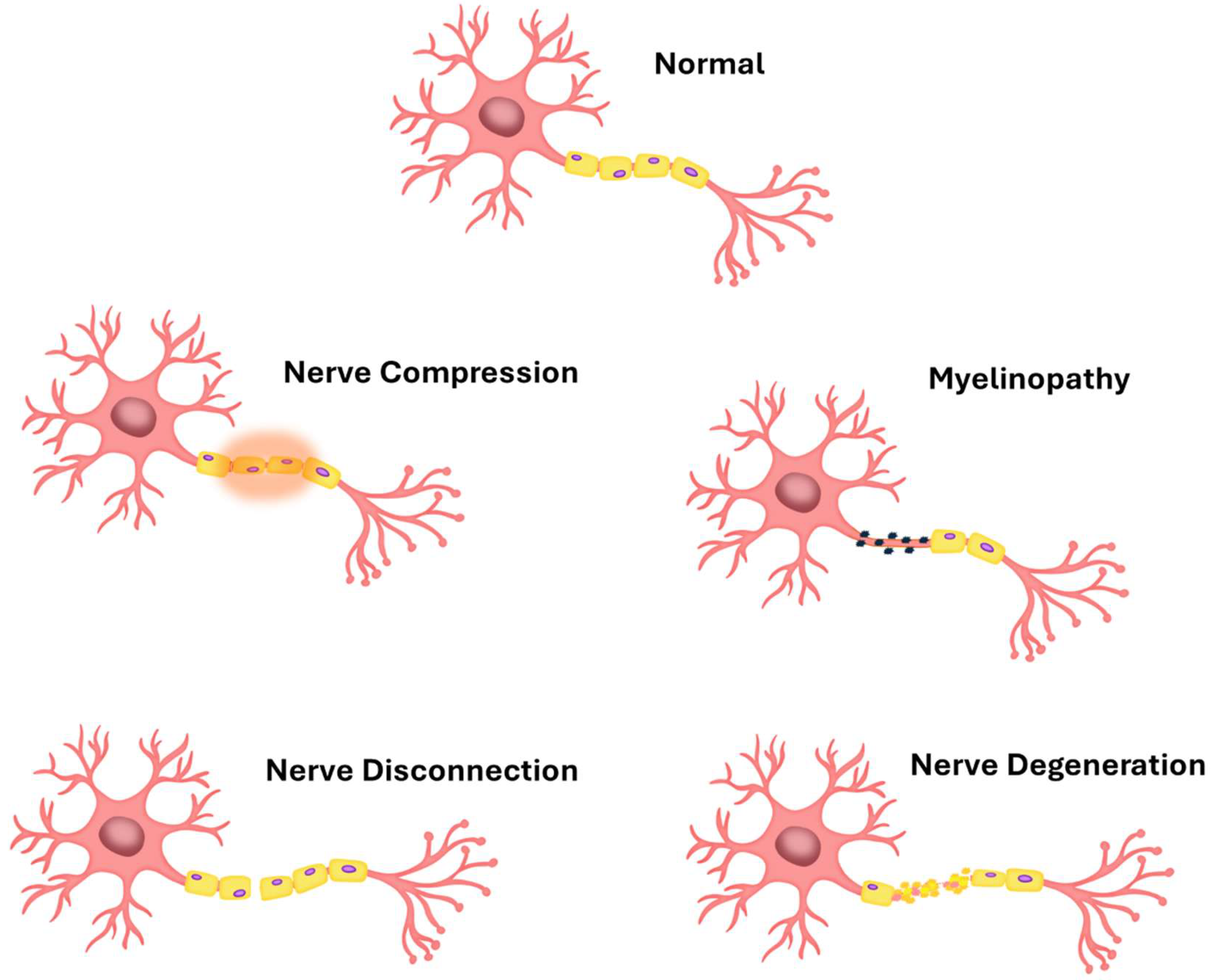 The injury can disrupt or inhibit regular mechanisms, resulting in incomplete myelination in damaged areas, which leads to conduction disturbances of nerve impulses. Therefore, it is not surprising that to re-establish cell function, it is necessary to restore myelination. Although research typically prioritizes axon regeneration over remyelination, in some instances, such as specific hereditary disorders or toxin-induced neuropathies, the myelin is primarily damaged, while the axons remain relatively intact, at least in the initial phases of the degeneration [122]. Thus, as the level of knowledge about the specificity of cellular impairment increases, the need to analyze remyelination dynamics becomes emphasized, as it is crucial for the development of effective therapy.