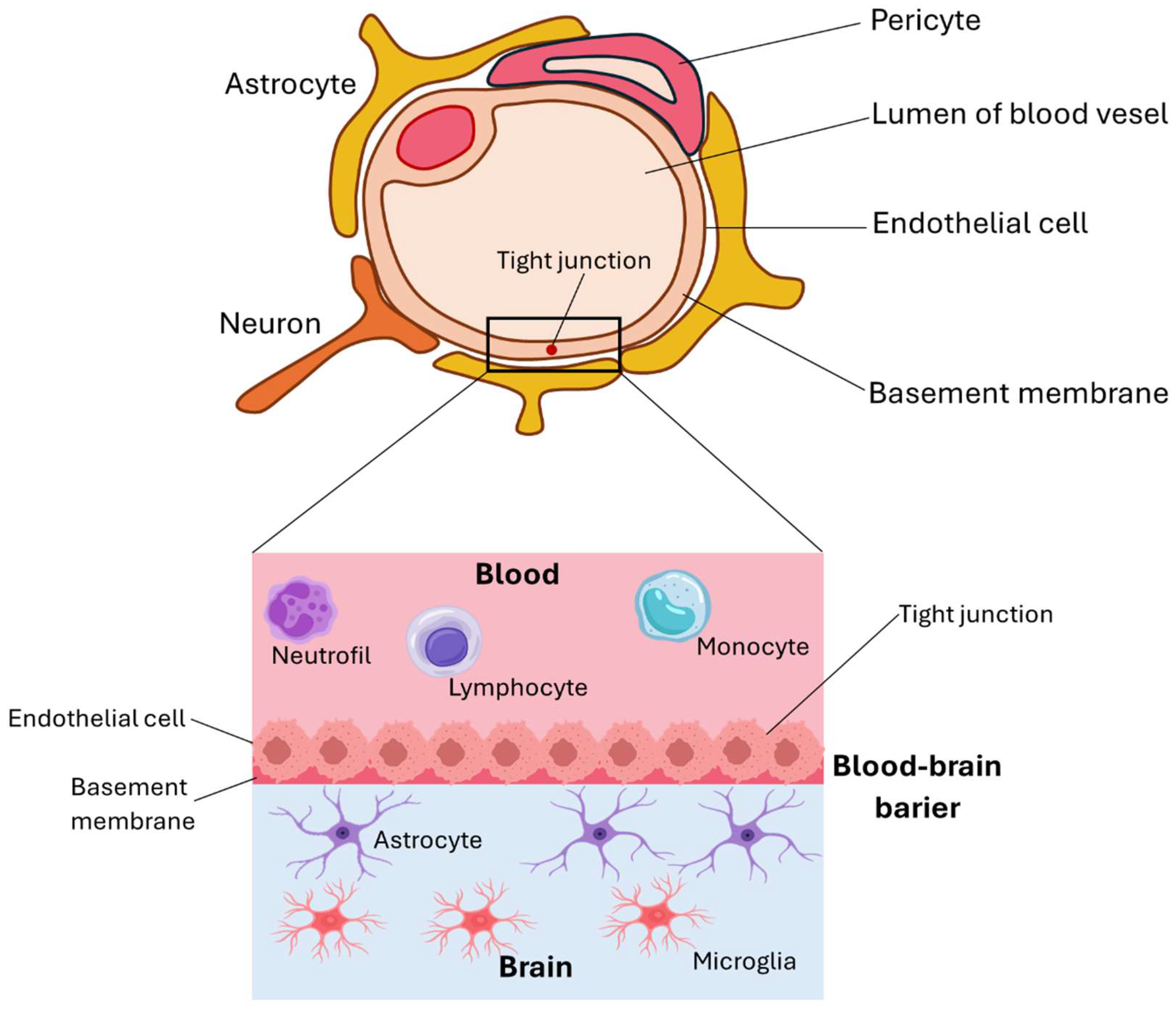As mentioned above, nervous tissue is characterized by poor regenerative capacity; therefore, all approaches aimed at supporting its growth are under extensive evaluation. For example, neural stem cell-based therapies for central nervous system restoration have attracted growing interest recently due to their potential for reconstructing damaged tissue through exogenous neural cell transplantation. The reason for this is that neural stem cells proliferate and are capable of long-term self-renewal, unlike mature neurons, which do not proliferate. Alternatively, some researchers place greater emphasis on advancements in materials engineering, proposing that the development of novel biomaterial surfaces capable of supporting neural regeneration may offer scalable and economically advantageous solutions for tissue repair. It may, in turn, enable the use of techniques from the field of nanotechnology and neurobiology, providing the opportunity to, among other things, thoroughly understand the structure and function of nervous tissue and influence the function of cells cultured on constructed substrates. Biomaterials engineering addresses nerve growth inhibition and loss of long-distance control problems, allowing for the expansion of therapy beyond cell-based approaches. Research has been conducted on materials that exhibit electrical and/or biomechanical properties, which trigger and enhance nerve regeneration. For that purpose, natural, synthetic, and conductive polymers are considered. Materials with incorporated nanoparticles are also employed; they are particularly valued for their ability to cross the blood–brain barrier (Figure 2 illustrates this barrier). Moreover, biomaterial scaffolds in combination with growth factors, such as brain-derived neurotrophic factor (BDNF), basic fibroblast growth factor (bFGF), or vascular endothelial growth factor (VEGF), are reported to potentially stimulate neurogenesis directly at the injured site [14].