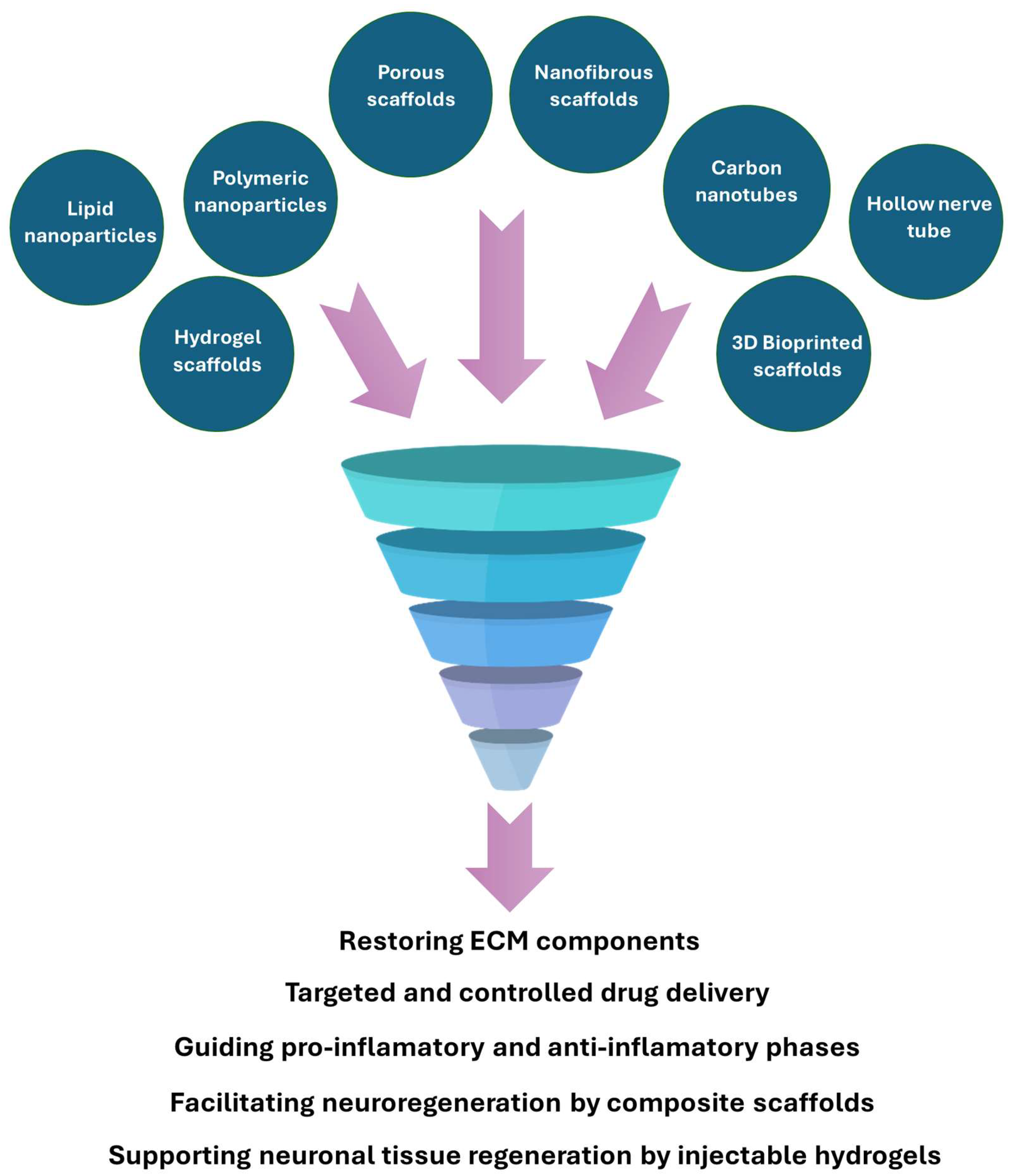 The effectiveness of a material system depends on translational barriers; hence, its design depends on the intended mode of action, such as triggering and enhancing nerve regeneration, and stimulating/supporting neurogenesis directly at the injured site.