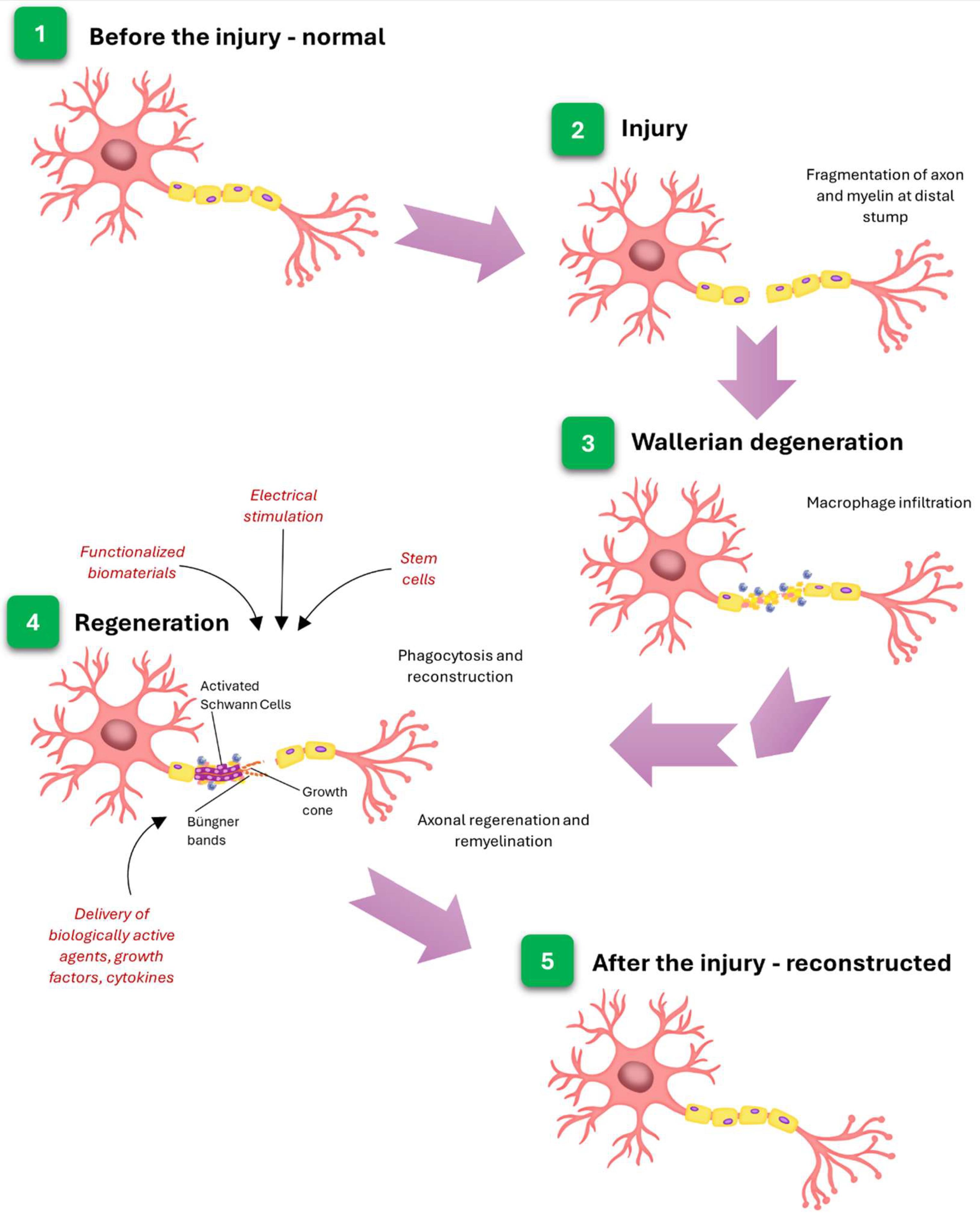 Neurodegenerative diseases are characterized by progressive damage to the nervous system’s structures. These disorders are currently essentially incurable, as mature cells of the nervous system do not tend to regenerate. In Figure 1, a schematic representation of nervous cell degeneration, as described by Waller, is presented.