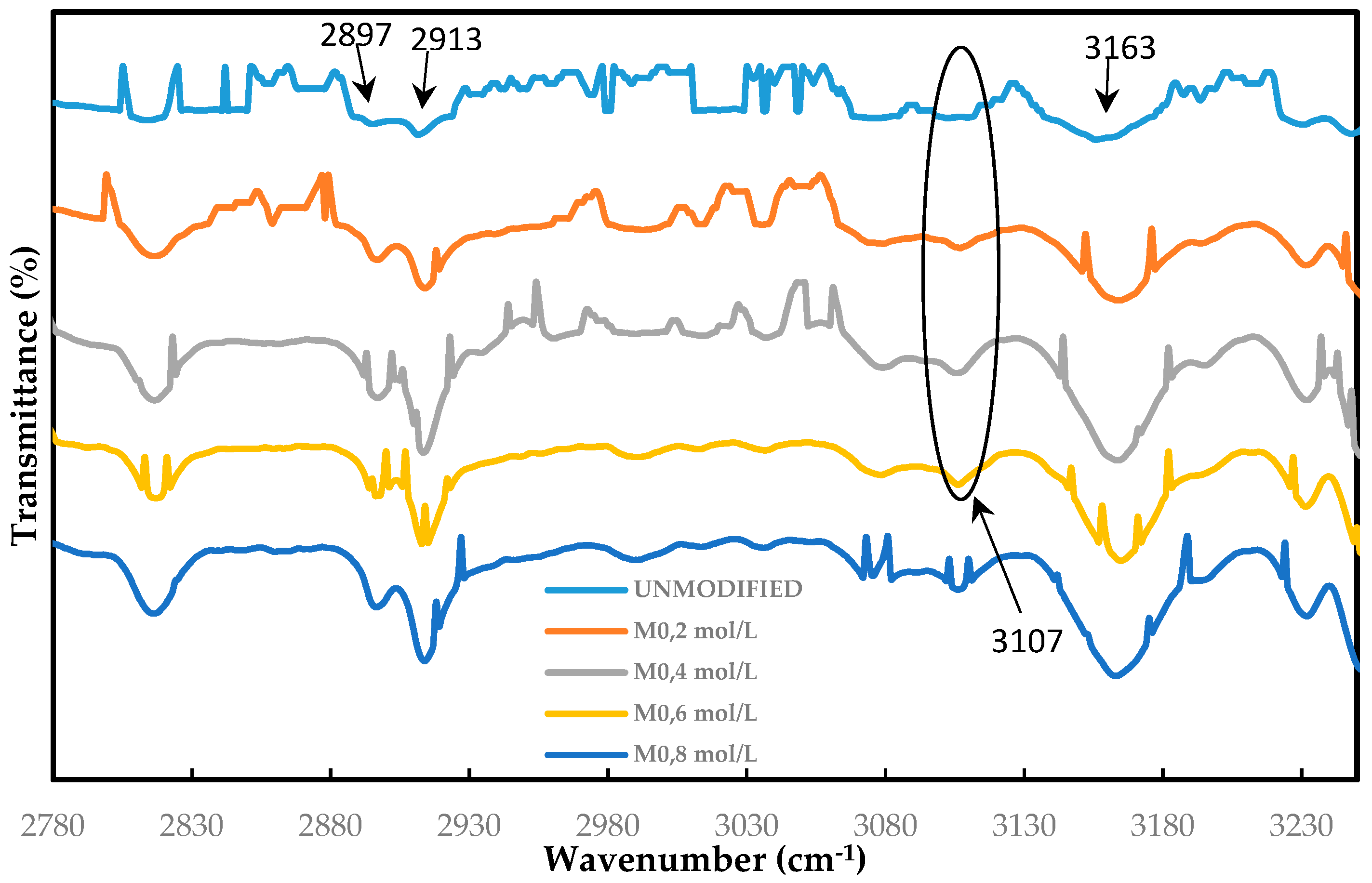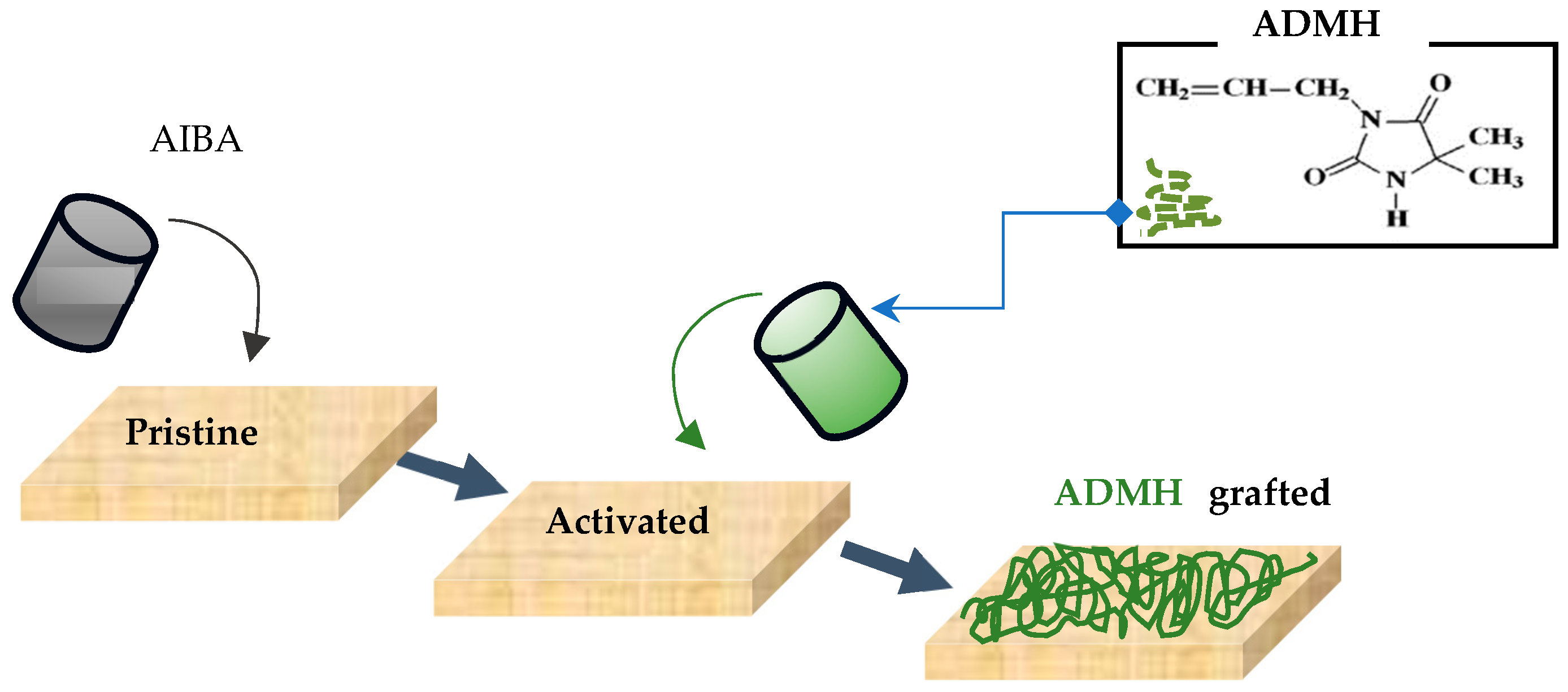 - SEM, FTIR, NMR, and contact angle confirmed ADMH grafting. SEM revealed surface irregularities and a distinct top-layer formation, FTIR showed new peaks, including a C=O bond at 3107 cm−1, and NMR detected characteristic ADMH signals with a ppm shift at 130.4 (═CHCH2). The contact angle analysis showed that grafting reduced surface hydrophobicity, particularly at moderate ADMH concentrations, supporting enhanced water membrane interactions.