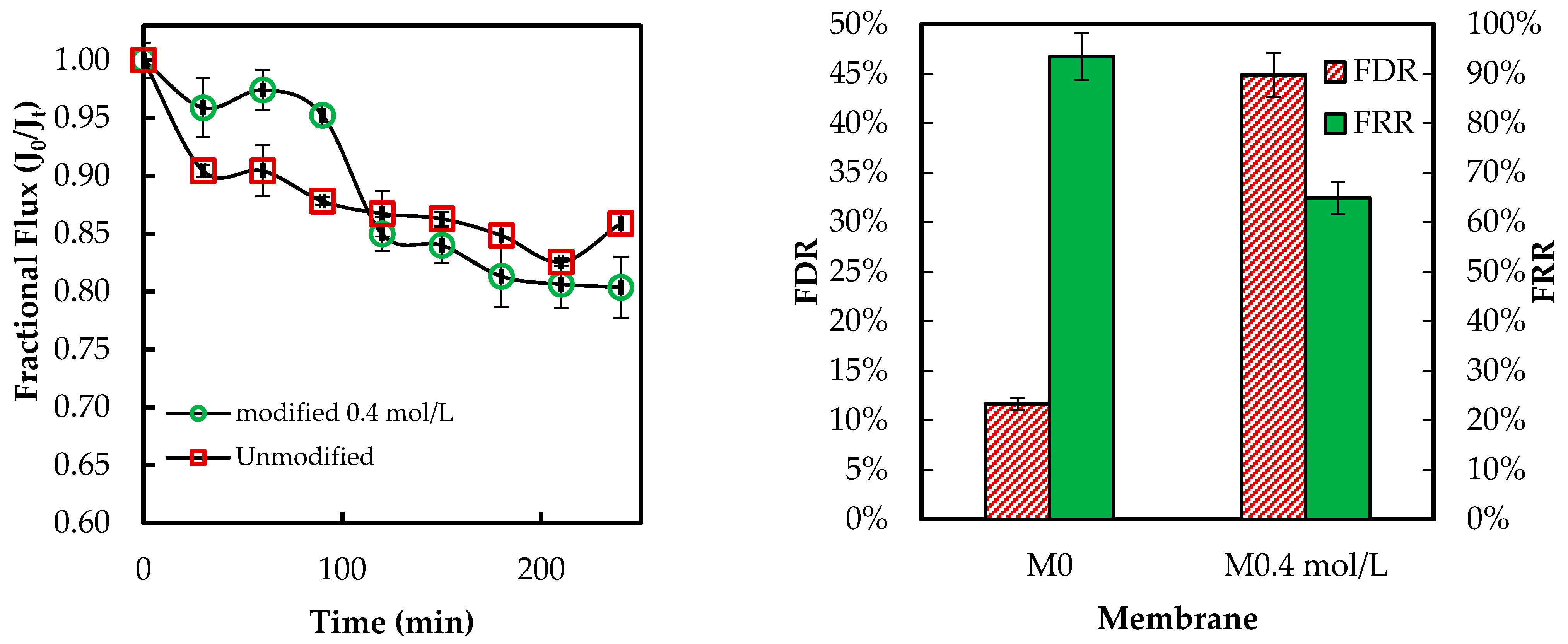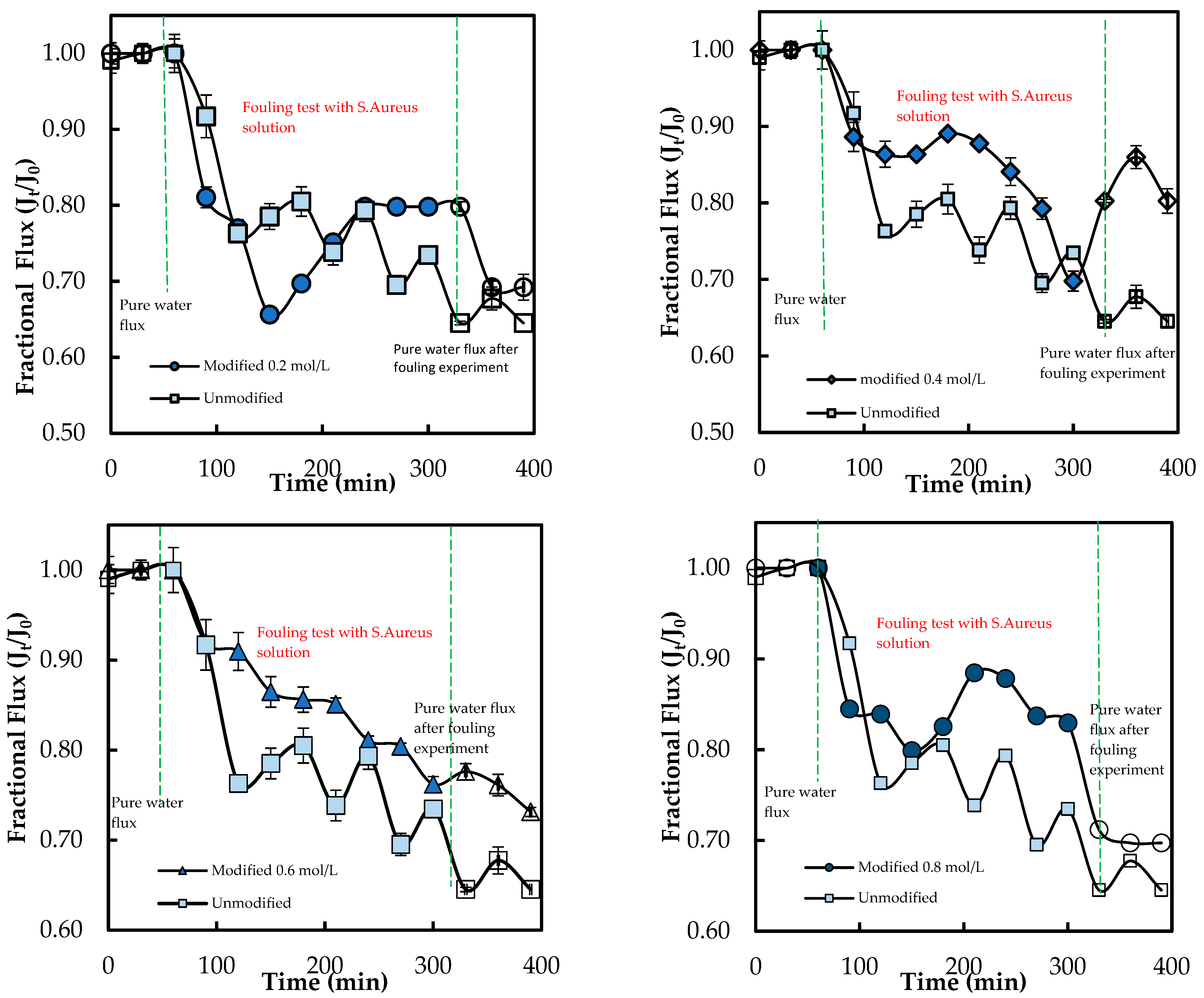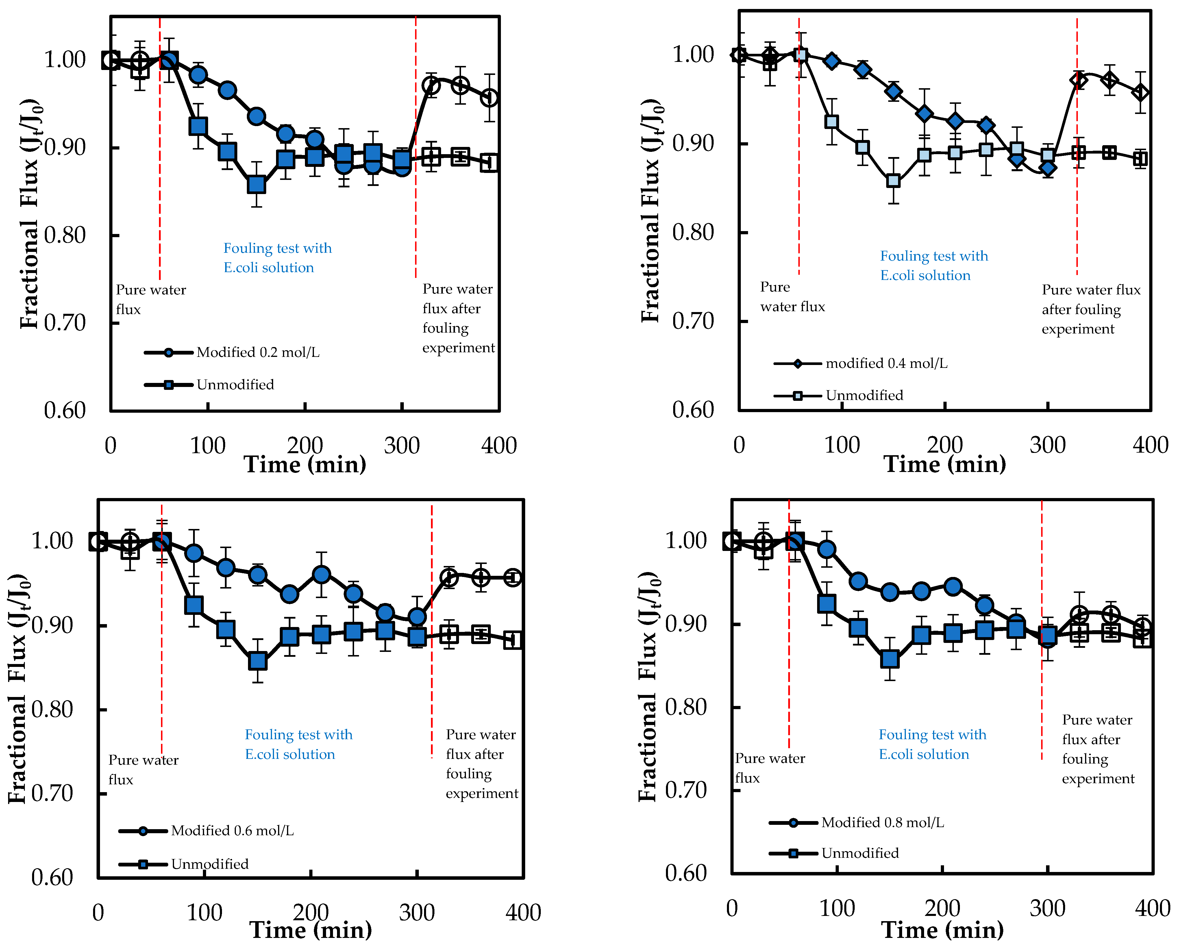 - The biofouling resistance test demonstrated improved biofouling resistance properties after the grafting of ADMH on the membrane surface. The M0.2mol/L and M0.6mol/L membranes exhibited the lowest FDR values of 3.72% against S. aureus and 8.91% against E. coli, respectively, with FRR values of 69.23% and 96.88%. The M0.4mol/L showed an FRR value of 94.27% against E. coli bacteria and 59.70% against S. aureus.