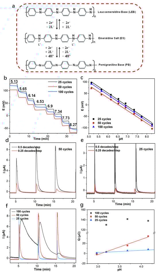 (a) The ion-to-electron transfer mechanisms of PANI solid contact; potentiometric measurement (b) and calibration (c) of PANI-based pH sensor with pH changes at 0.5 decades/step; (d) amperometric and (e) coulometric response of PANI-based pH sensor with 50 cycles under pH changes of 0.5 and 0.25 decades/step. (f) amperometric and (g) coulometric response of PANI-based pH sensors with 25, 50, and 100 polymerization cycles; The measurements were conducted in a Tris-buffer solution containing 0.2 M NaOH. pH adjustments were made by adding specific volumes of 0.2 M NaOH.