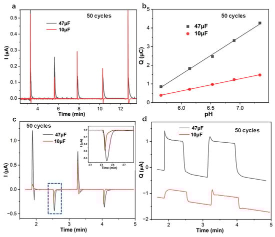 (a) Amperometric and (b) coulometric response of PANI-based pH sensor with 50 cycles in series with capacitors 10 μF and 47 μF with pH changes at 0.5 decades/step; Reversible (c) amperometric and (d) coulometric response of PANI-based pH sensor with 50 cycles in series with capacitors (10 μF, 47 μF), while the pH of electrolyte switches between 7 and 7.5.