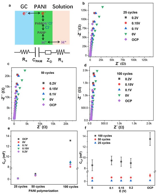 (a) Schematic picture of ion-to-electron transfer mechanisms of the PANI-based GC electrode and the corresponding equivalent circuits; electrochemical impedance spectrum of the PANI-based GC electrode with (b) 25, (c) 50, and (d) 100 cycles with applied potentials at open circuit potential (OCP), 0 V, 0.1 V, 0.15 V, and 0.2 V in 0.1 M HCl aqueous solution; (e) the corresponding EIS low-frequency capacitance CLF of the PANI-based GC electrode with 25, 50, and 100 cycles determined at 10 mHz; (f) EIS low-frequency capacitance CLF (10 mHz) of the PANI-based GC electrode with 25, 50, and 100 cycles vs. the applied potentials.