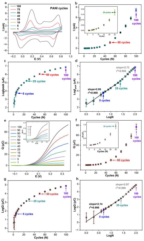 (a) Cyclic voltammograms of the PANI-based pH sensor with polymerization cycles ranging from 1 to 100 cycles. (b) The oxidative peak current (Ipeak, mA) of PANI-based GC electrodes with 25, 50, and 100 cycles at 0.2 V. (c) The logarithmic oxidative peak current (logIpeak, µA) of PANI-based GC electrodes vs. PANI polymerization cycles (N). (d) logIpeak vs. logN. (e) The corresponding cumulated charge Q of cyclic voltamograms of PANI polymerization at oxidative peak 0.2 V. (f) The cumulated charge Q of the corresponding cyclic voltammograms of PANI-based GC electrodes with 25, 50, and 100 cycles at 0.2 V with 50 mV/s. (g) The logarithmic charge (logQ, µC) of PANI-based GC electrodes vs. PANI polymerization cycles (N). (h) logQ vs. logN. Number of electrodes for PANI with 1–25, 25–50, and 50–100 cycles is 9, 6, and 3, respectively.
