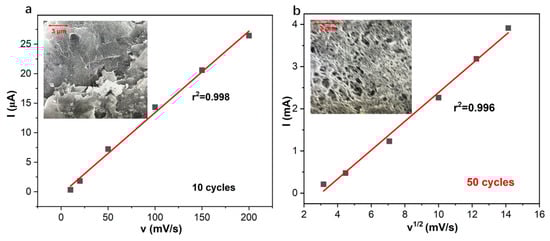 The initial steep film growth, most pronounced within the first ~10 cycles (Figure 4c,g), exhibits slopes of ca. 0.13 µA/cycle and 0.13 µC/cycle for both logIpeak vs. logN and logQ vs. logN, which can be mechanistically attributed to highly efficient interfacial charge transfer at the pristine glassy carbon electrode surface. At the start-up stage, aniline monomers adsorb and undergo rapid nucleation and two-dimensional growth, leading to swift surface coverage and initial film thickening. The electrochemical signature of this mechanism is a linear dependence of the oxidative peak current on the scan rate (v) (Figure 5a), a hallmark of a surface-confined, adsorption-controlled process where the reaction rate is governed by the number of accessible surface sites [39,40].