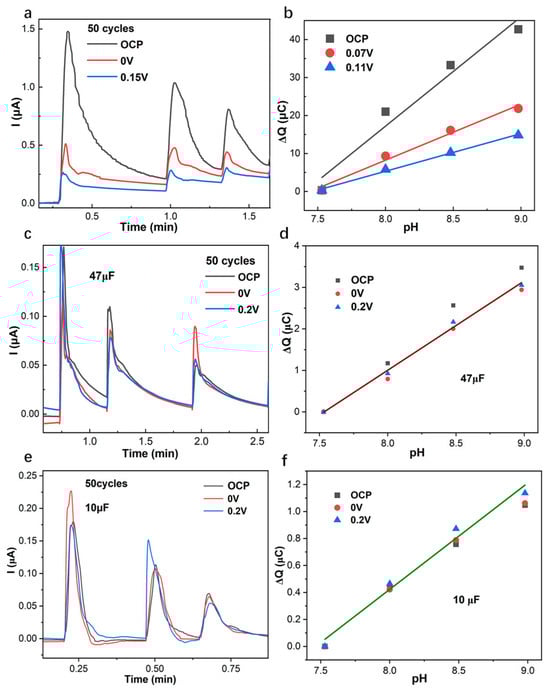 Amperometric response vs. time and the corresponding cumulated charge Q vs. pH of PANI-based GC electrode with 50 cycles at open circuit potential (OCP), 0 V and 0.2 V in the cases where there is no capacitor (a,b), and in series with capacitor 47 µF (c,d) and 10 µF (e,f).