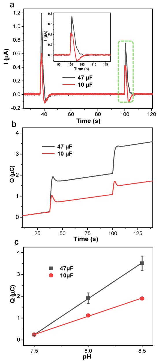 The chronoamperometric and coulometric reversible test of the PANI-based pH sensor with 50 cycles in connection with capacitors 10 µF and 47 µF was performed with a starting solution pH of Tris-buffer +0.2 M NaOH at 7 by adding a volume of 0.2 M NaOH to increase pH to 7.5 manually, and following that, the addition of certain volume of Tris-buffer solution results in pH back to 7. The pH changes in the aqueous solution were switched between 7 and 7.5.