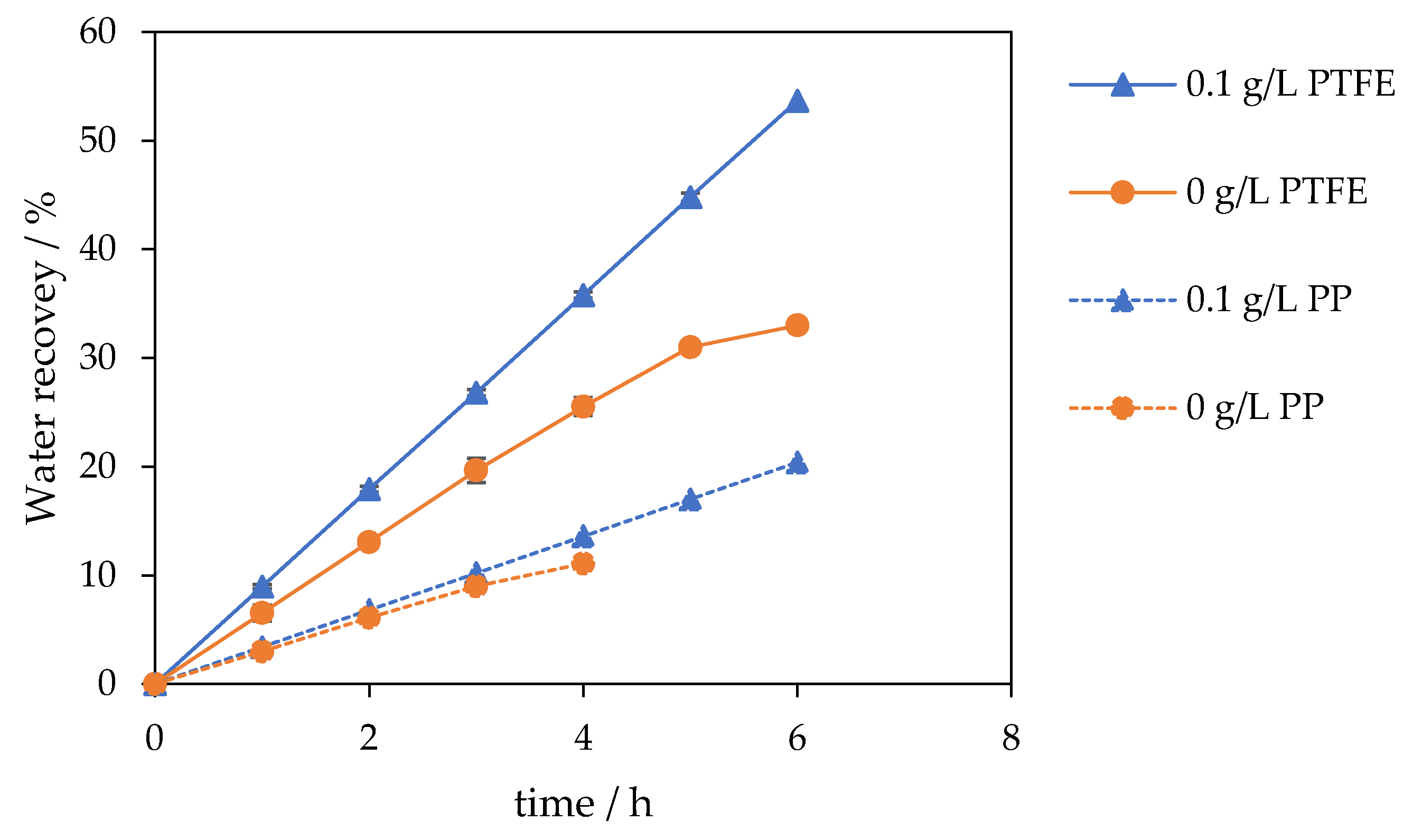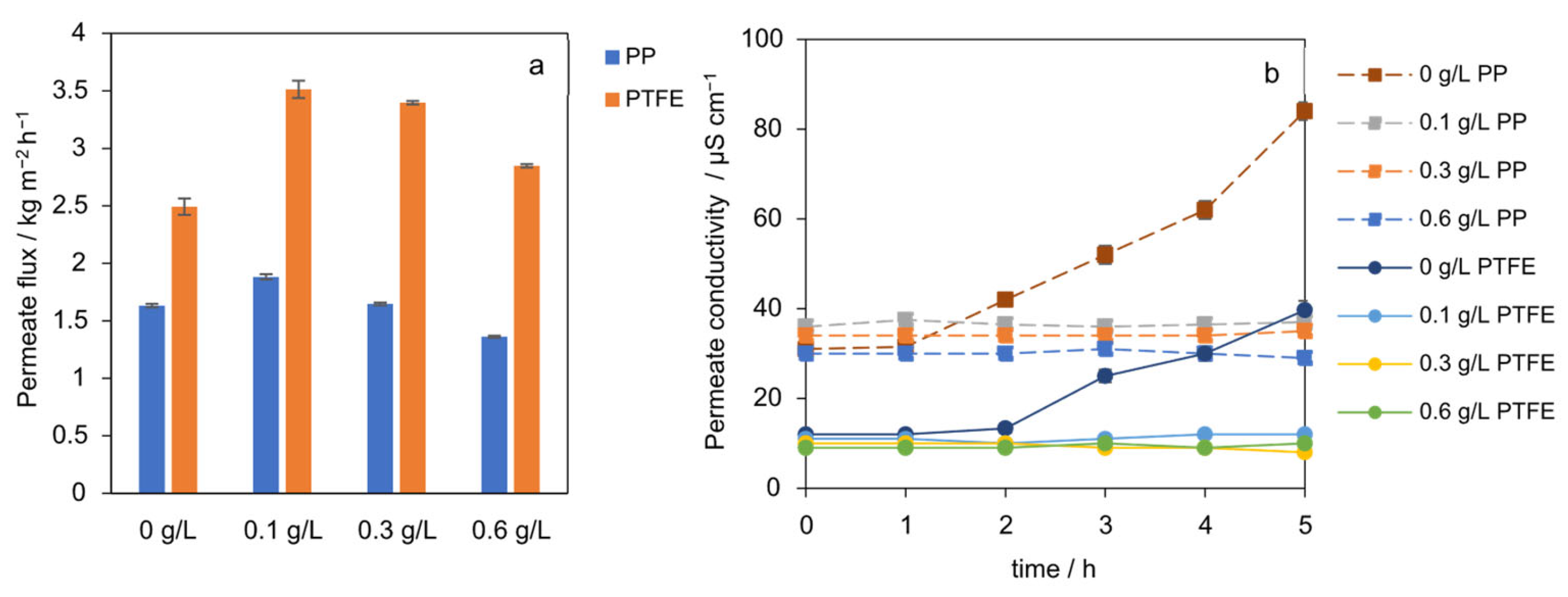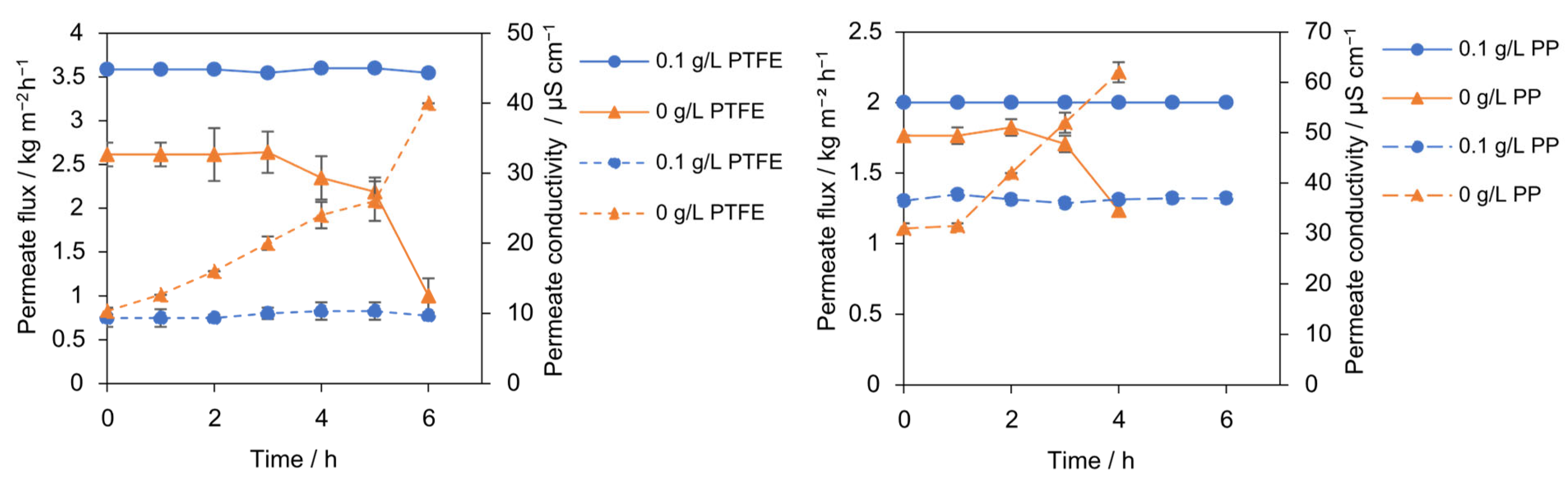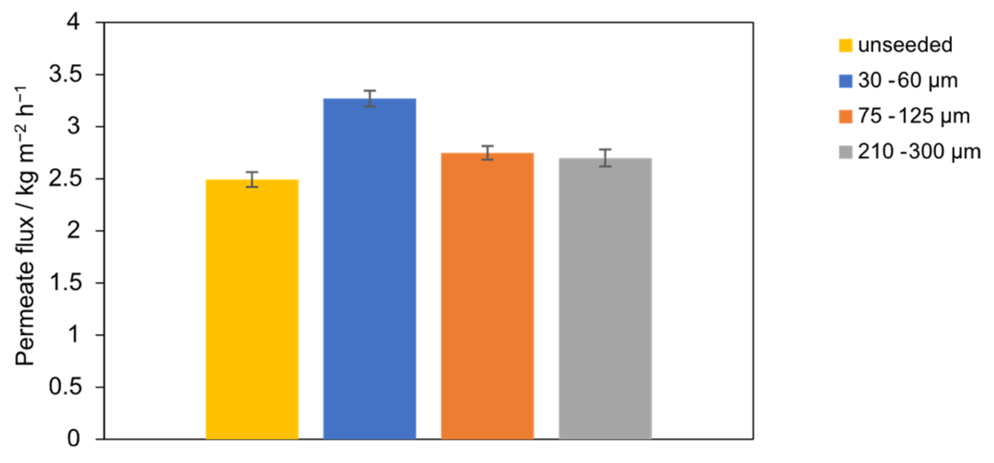 - Seeding concentration series (PP and PTFE): SiO2 concentrations of 0, 0.1, 0.3, and 0.6 g L−1 were tested to assess effects on permeate flux stability, wetting behavior, and product crystal size distribution (CSD).