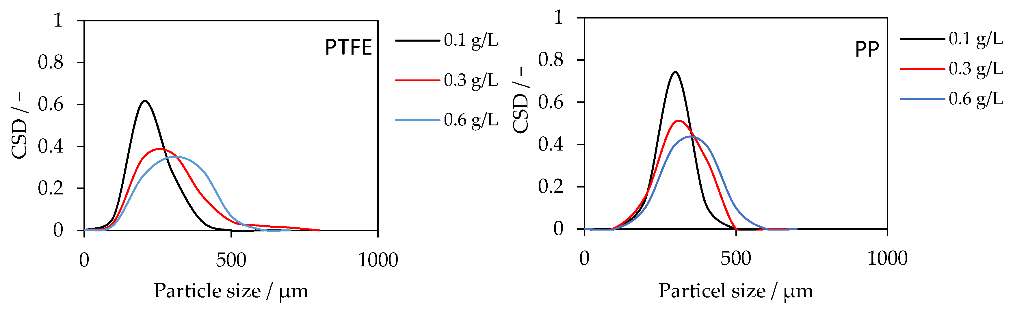 - Seed-size series (PTFE only): At a fixed SiO2 concentration of 0.1 g L−1, the effect of seed particle size was evaluated using three distinct fractions: 30–60 µm, 75–125 µm, and 210–300 µm. The analysis focused on the resulting changes in the CSD.